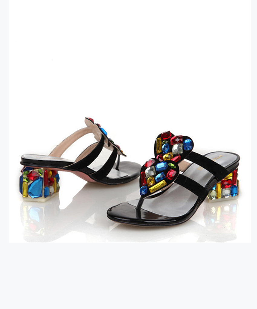 Boutique Black Heart Zircon Splicing Chunky Heel Flip Flops