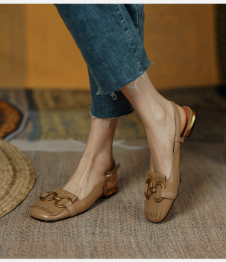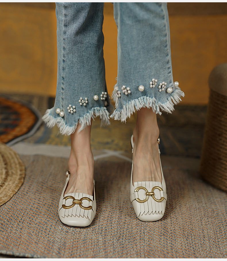 Elegant low chunky heels elevate your everyday look. Handmade with love from real leather. decorated with chain and tassel. Briley heels are the best you can get for under $200.