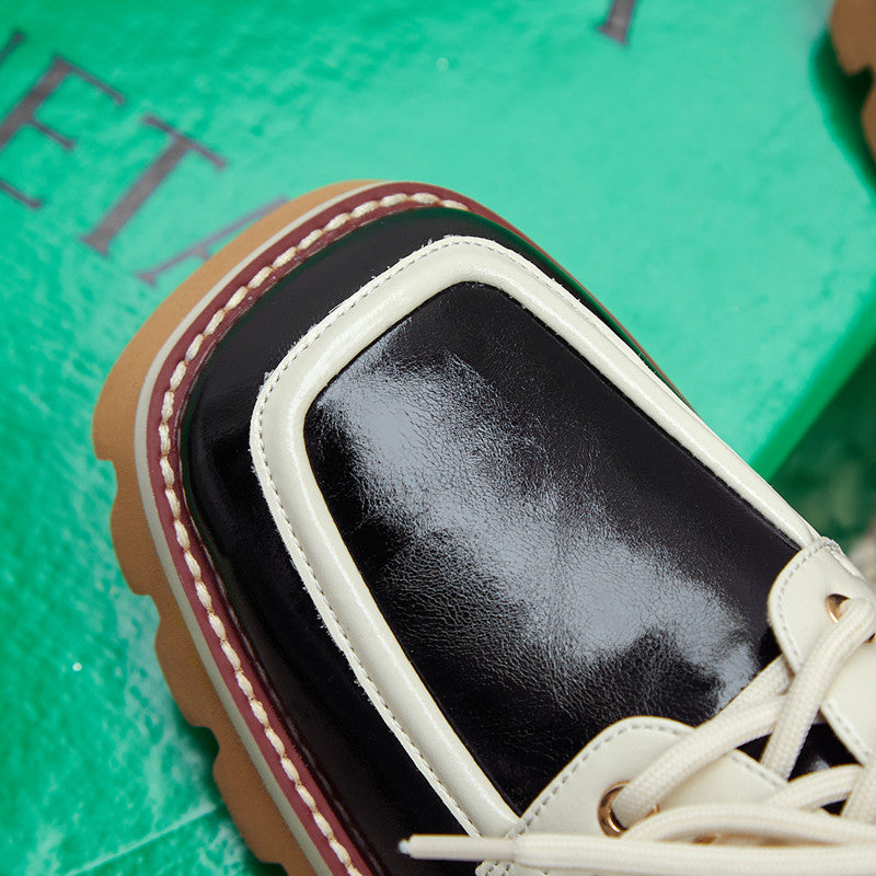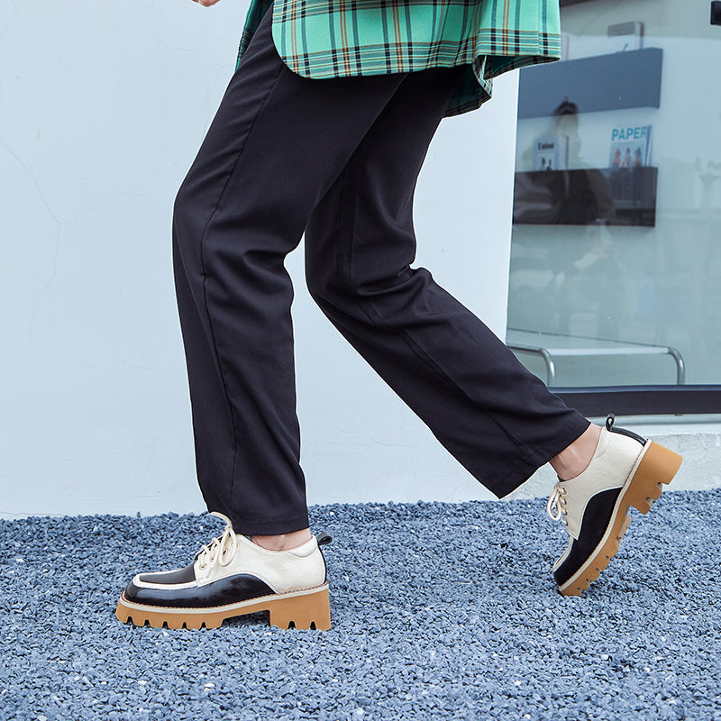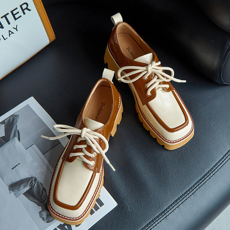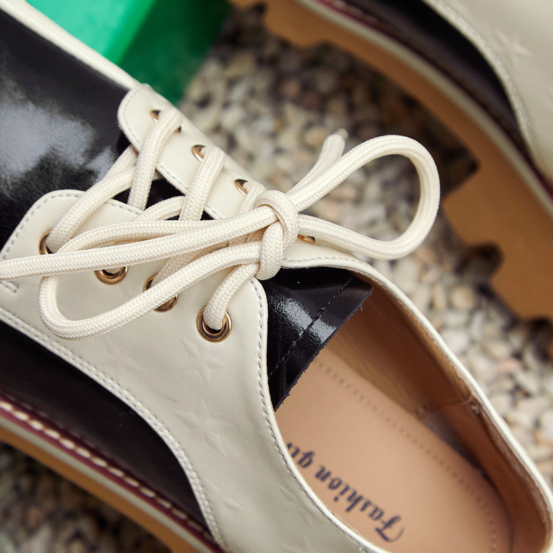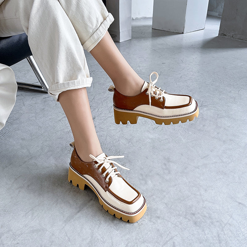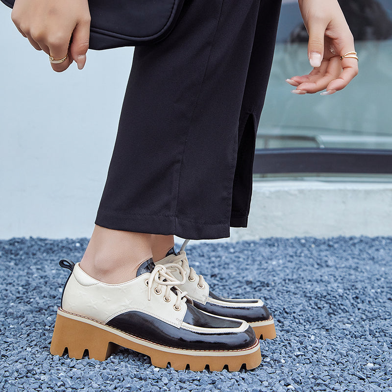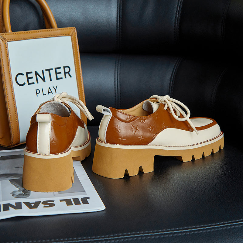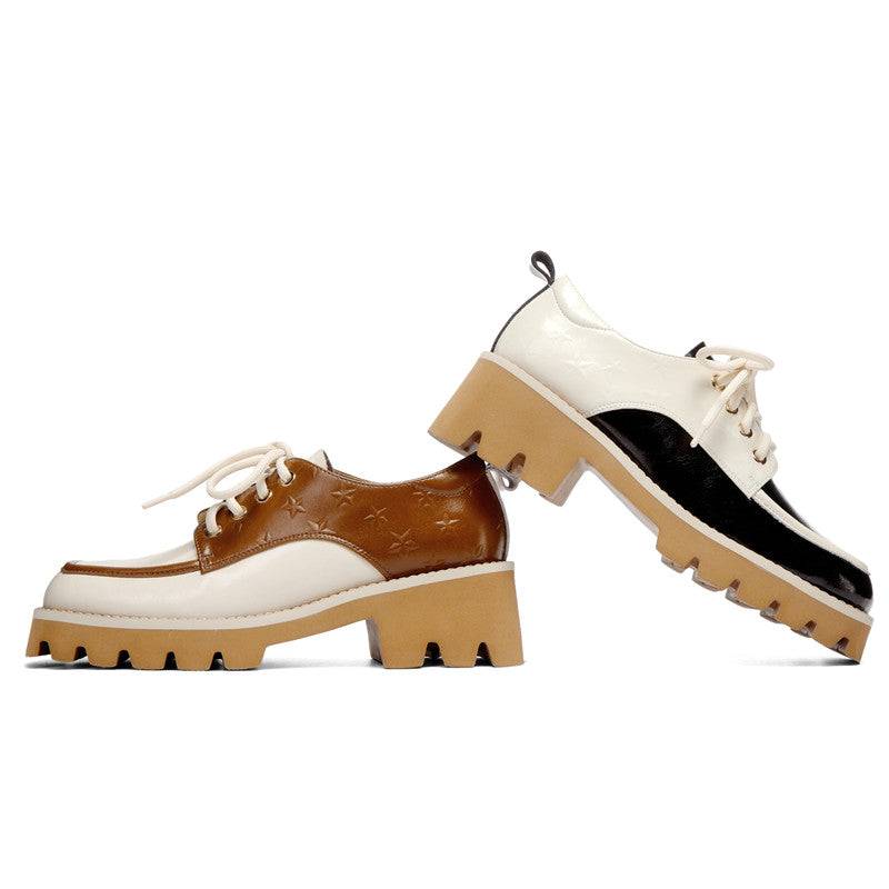 Designed with a square toe. printed with stars. handmade with premium leather. these chunky heeled oxfords are fashionable and stylish.