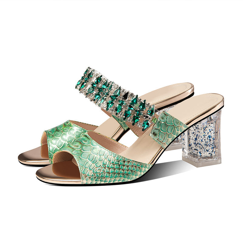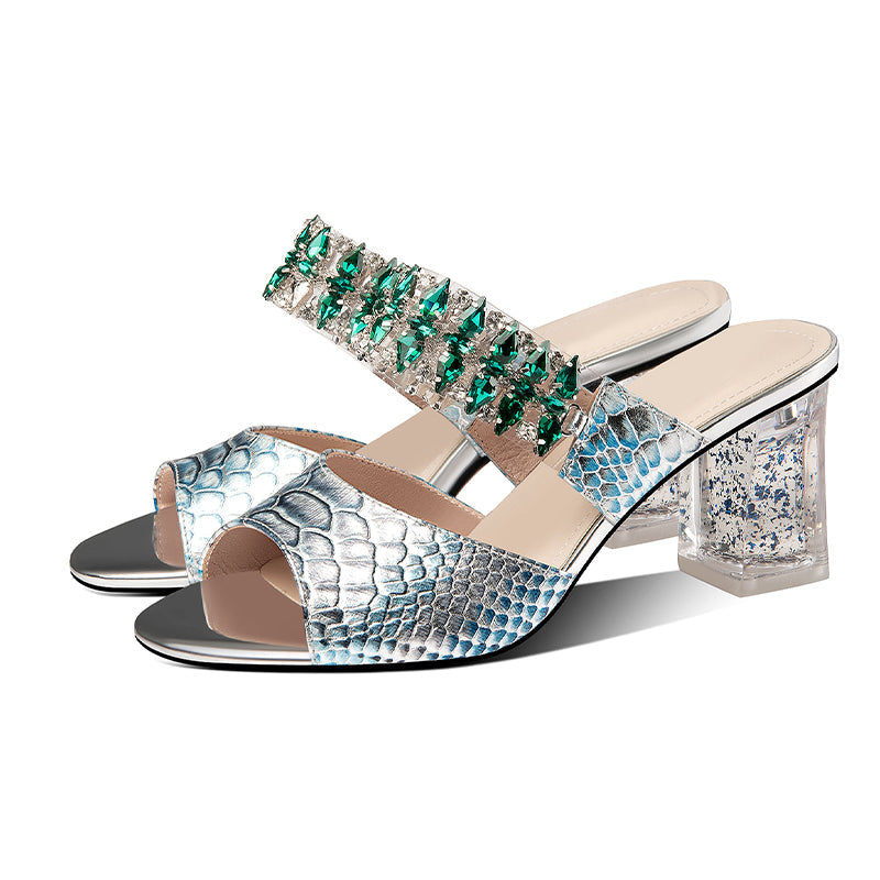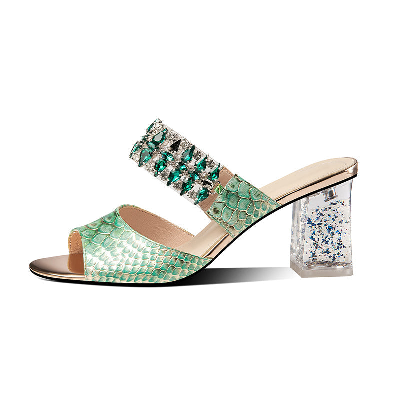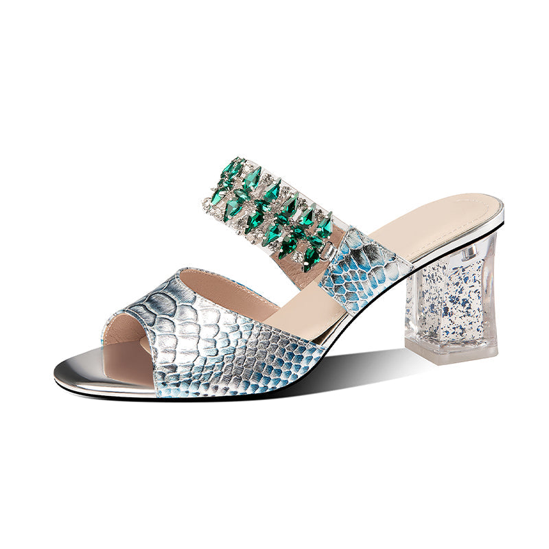 These print leather mules with rhinestones are unique. stylish and comfy.