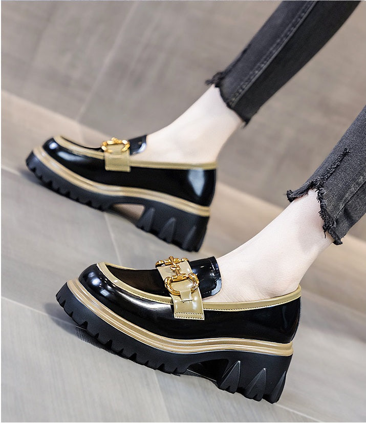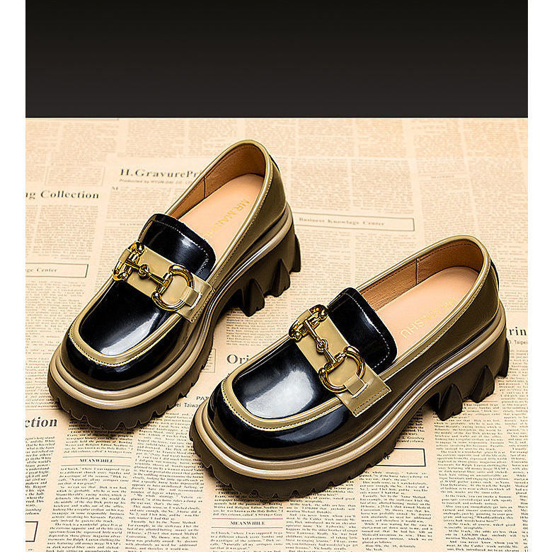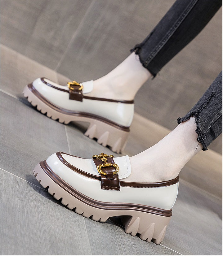 Designed with a square toe. decorated with metallic chains. handmade with premium leather. these chunky heeled loafers are fashionable and stylish.