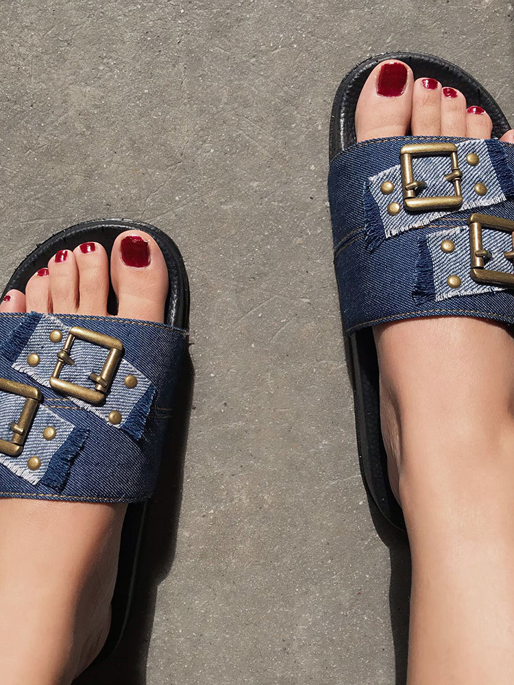 Denim Studded Buckle Slippers