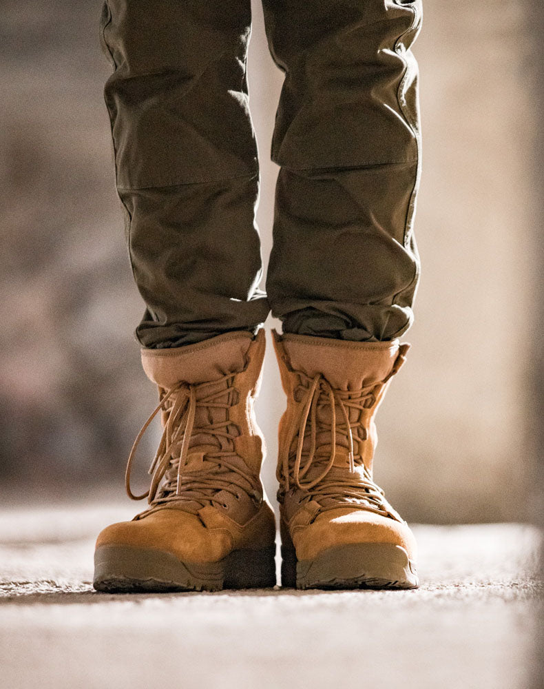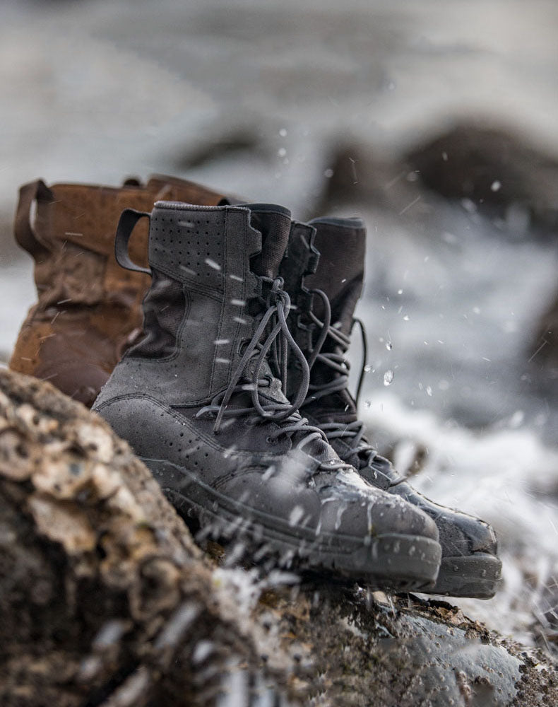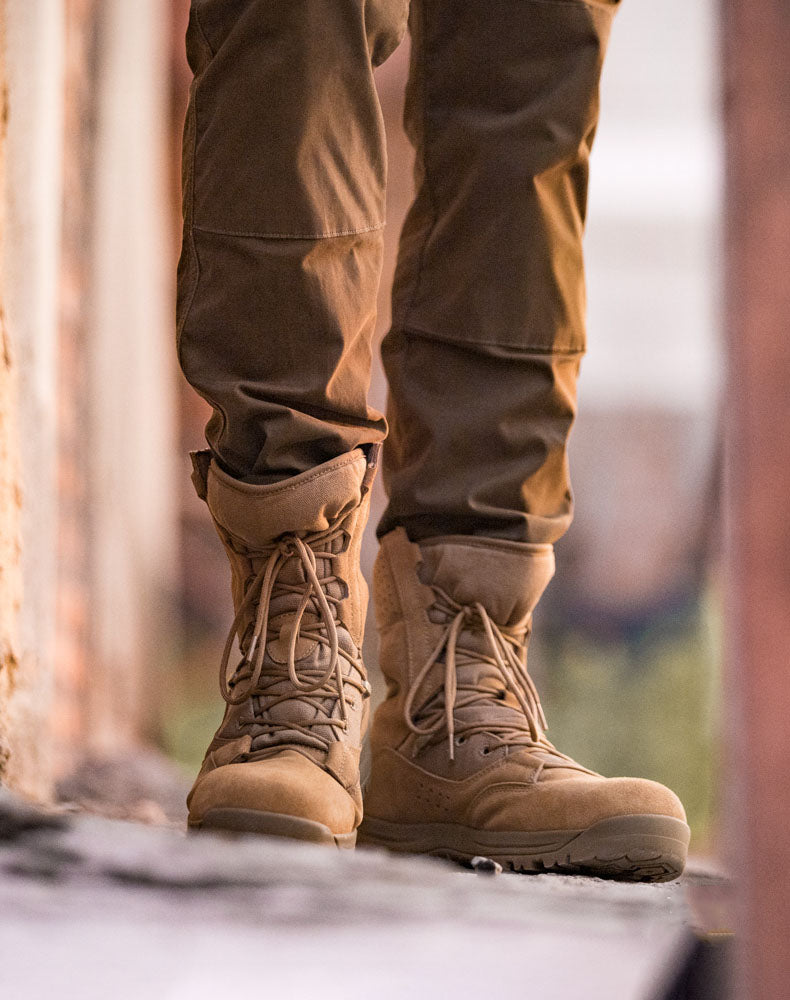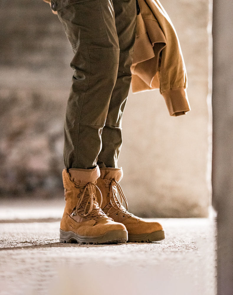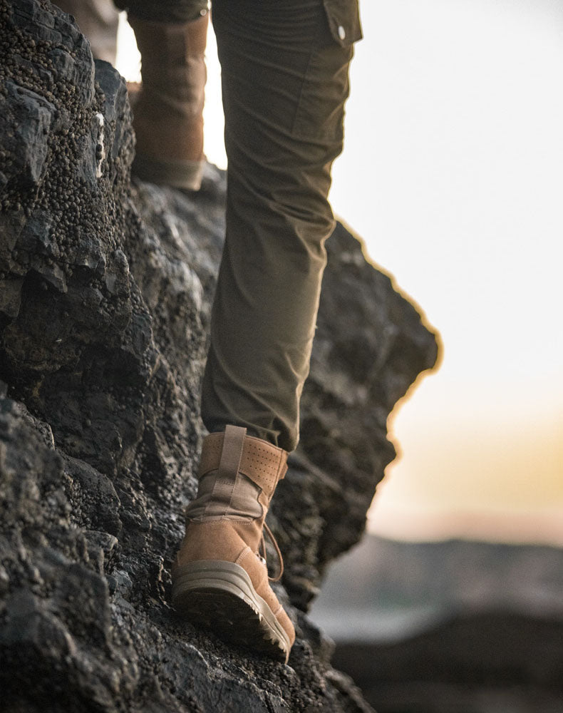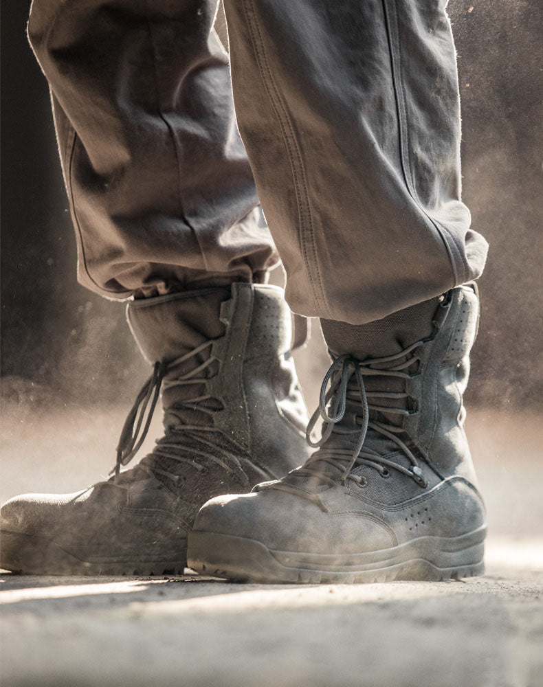 These tactical boots are built to withstand the toughest terrains. from rocky trails to muddy paths. The high-top design provides excellent ankle support. reducing the risk of twists and sprains while ensuring stability on uneven surfaces. With their lace-up closure. you can achieve a snug and secure fit. allowing you to conquer any challenge with confidence.