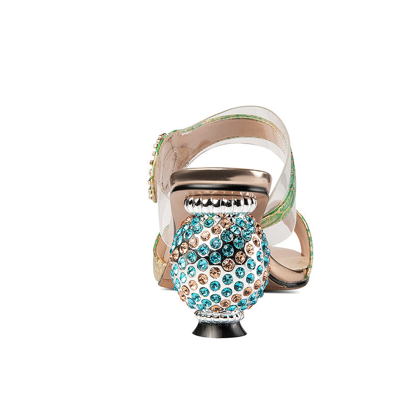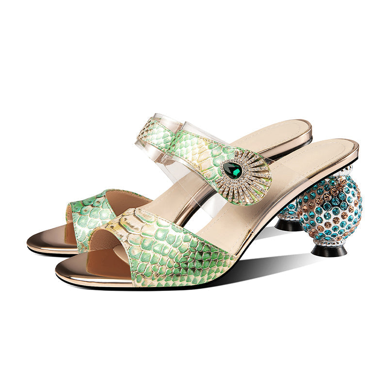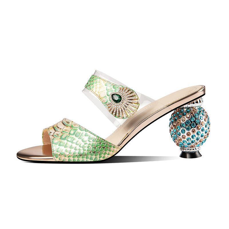 These print leather mules with rhinestones are unique. stylish and comfy.