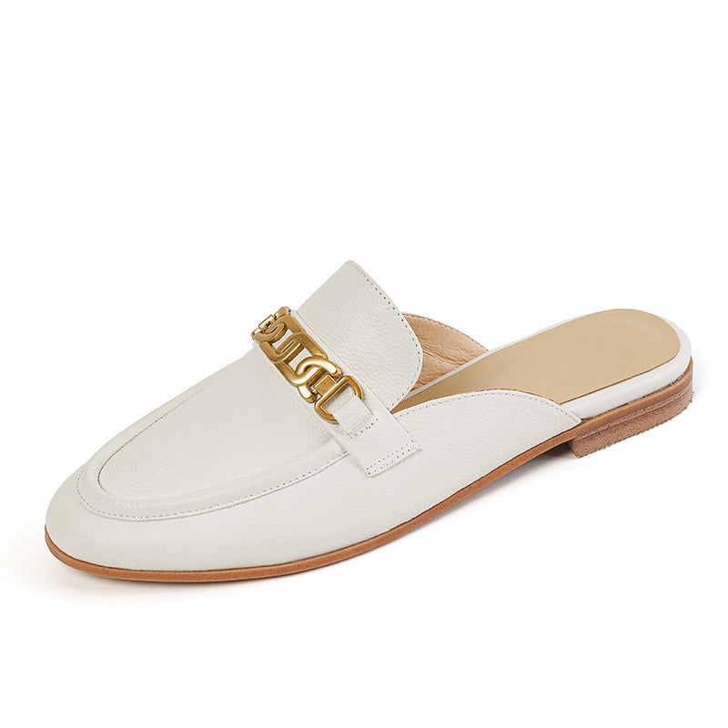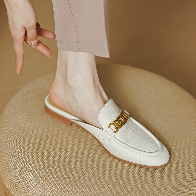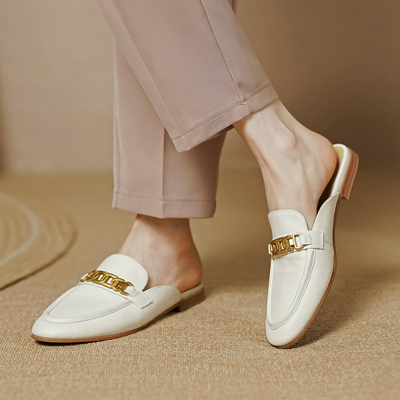 Handmade from premium leather. these loafer mules are really comfortable and breathable. Boasting chain decoration. these white mules help you show an easy chic look.
