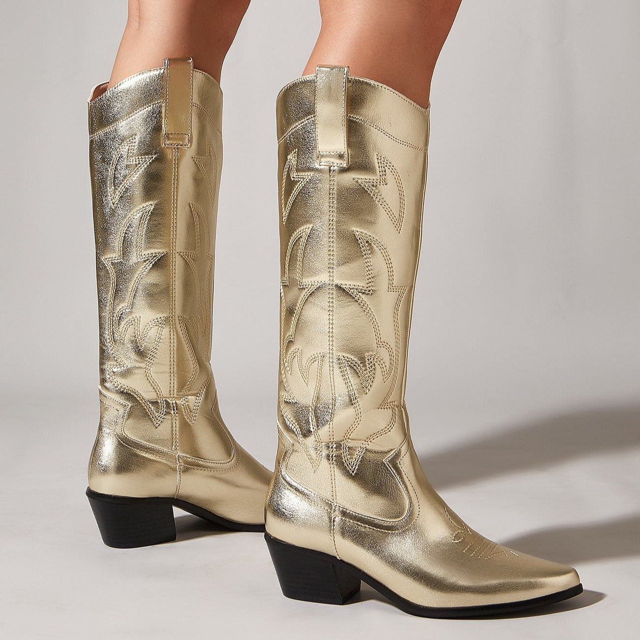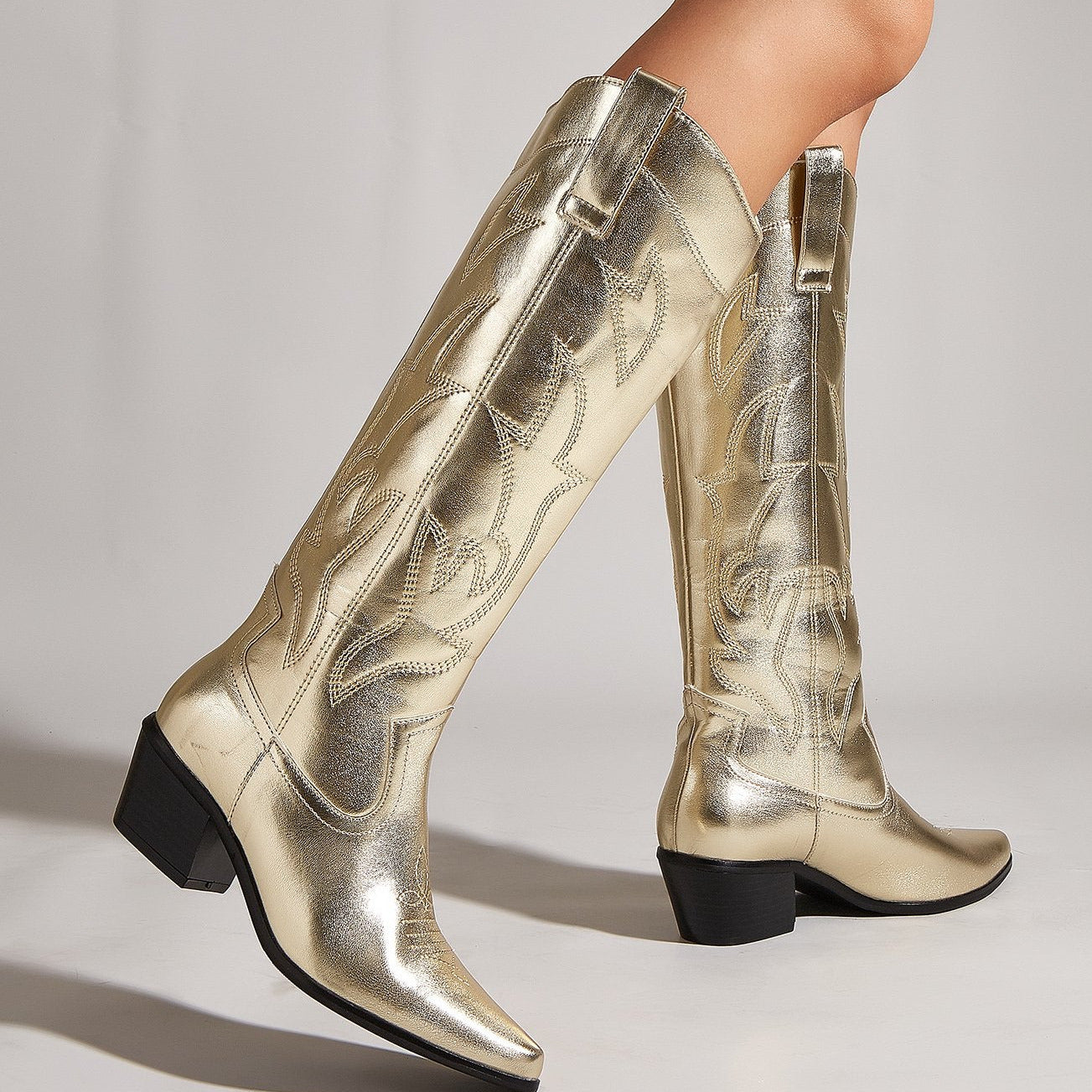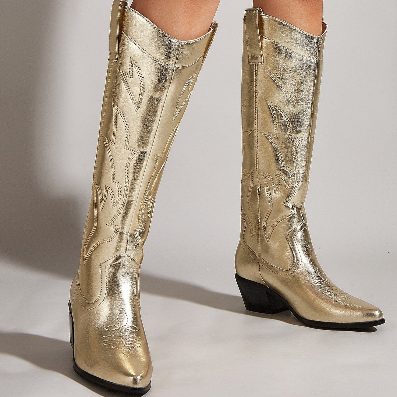 Embroidered Thick Heeled Pointed Toe Boots