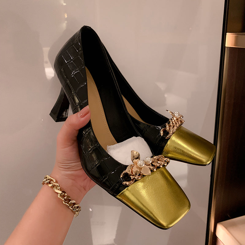 Looking to add a touch of luxury to your wardrobe? These stunning black and gold square toe heels are perfect for making a statement. Crafted from crocodile leather. they feature a gold chain detail and a beautiful pearl accent. Whether you're dressing up for a special occasion or simply want to elevate your everyday style. these pumps are sure to turn heads.