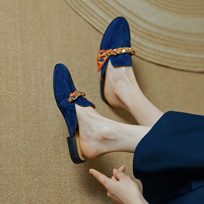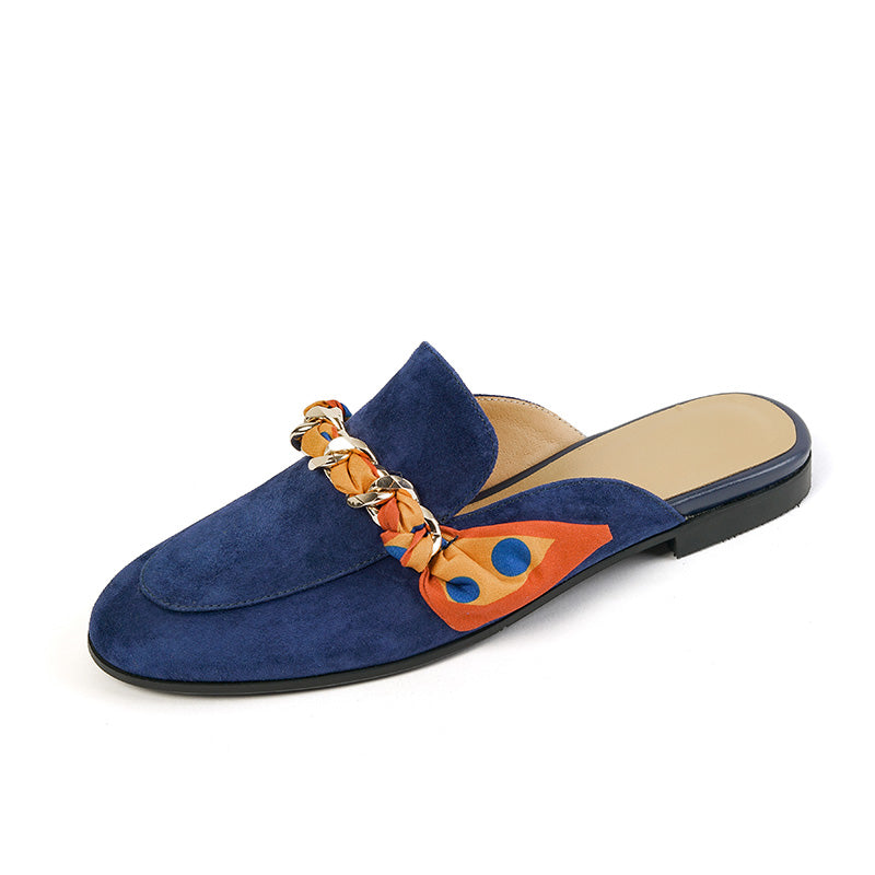 Handmade from navy suede. these flat mules are really comfortable and breathable. With the chain and cloth decoration. these embellished shoes are ideal for a versatile look.