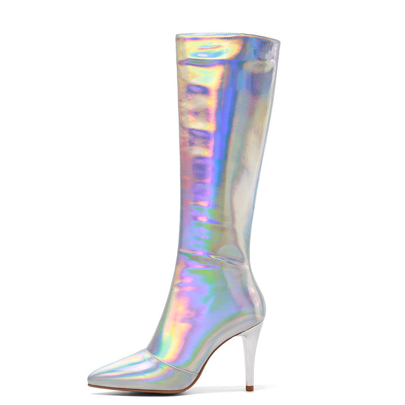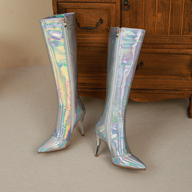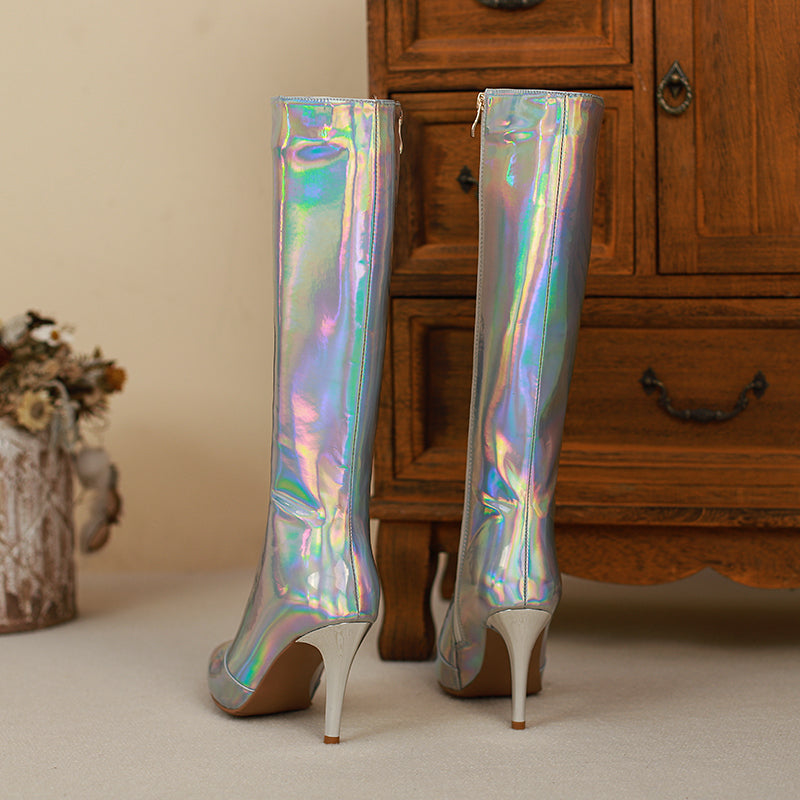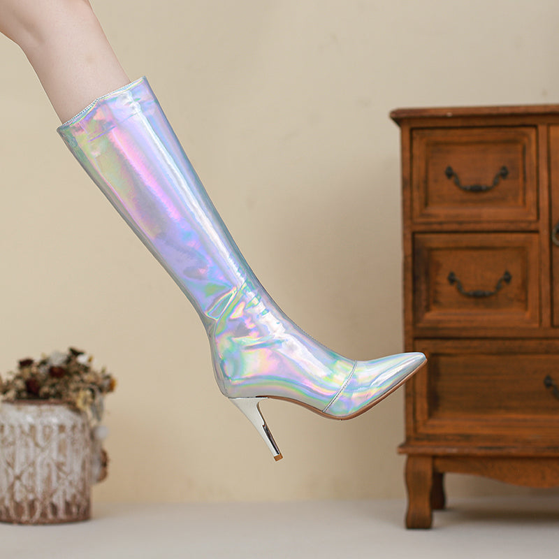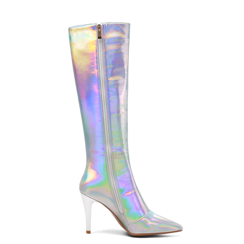 Looking for a new way to stand out from the crowd? Check out our holographic knee high boots! These pointed-toe stunners are sure to turn heads. with their stiletto heels and zip-up design. Whether you're looking for a night out on the town or just want to add a little extra flair to your everyday look. our holographic boots are sure to make a statement. So don't wait any longer. grab a pair of these show-stopping shoes today!
