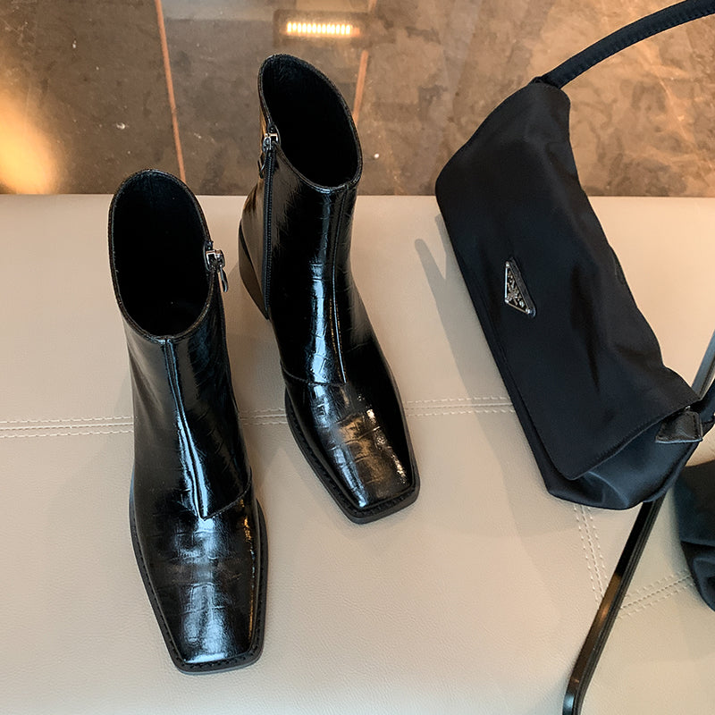 If you're looking for a pair of sock boots that's both stylish and comfortable. then check out our square toe heeled ankle boots. Made from crocodile embossed leather. these black booties are perfect for any occasion. And with their cushioned insoles and low heels. you can wear them all day without worrying about your feet.