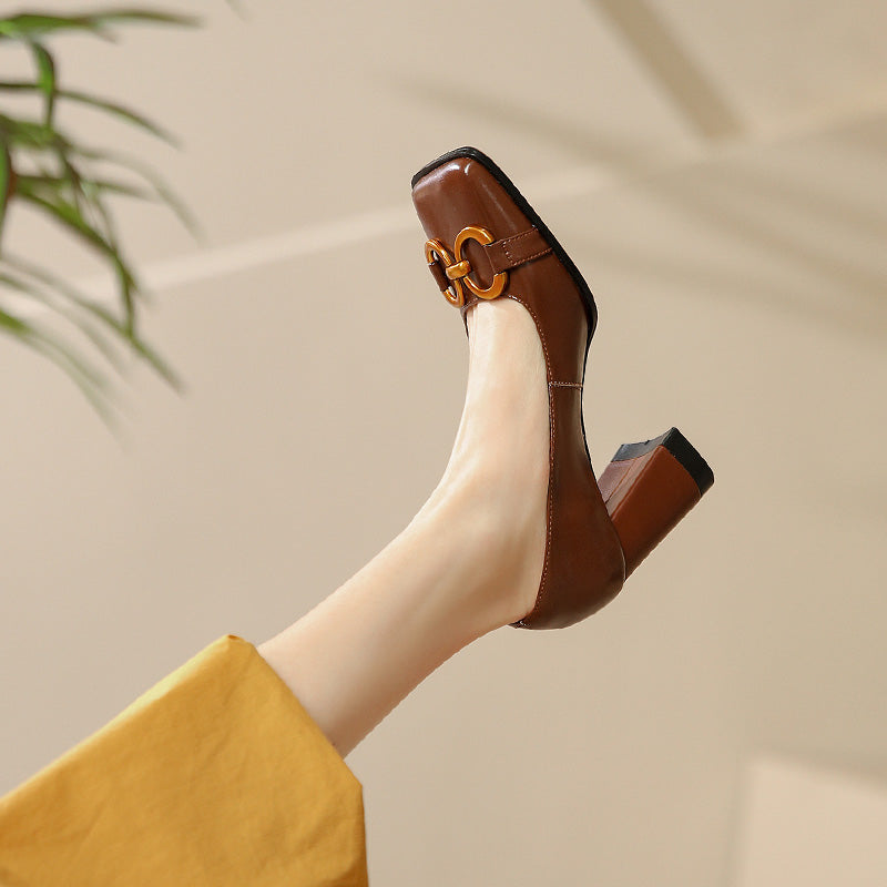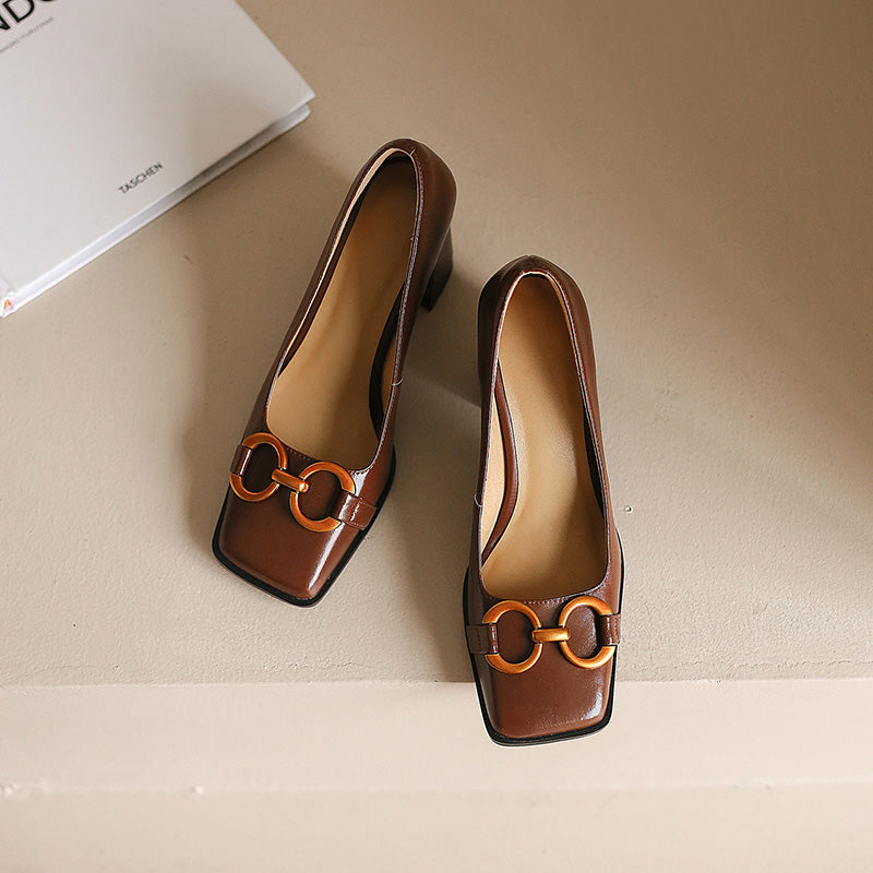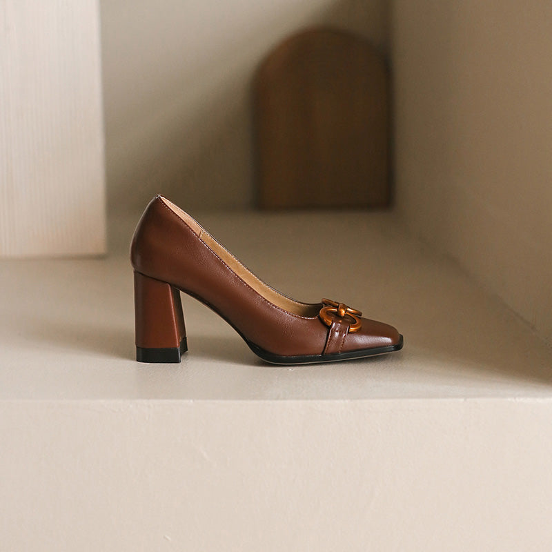 These square toe gold chain heels are the perfect addition to any outfit. The leather is soft and supple. and the brown color is rich and luxurious. The slip-on design is easy to wear. and the 3'' block heel adds just the right amount of height. Whether you're dressing up for a special occasion or just looking to add a touch of glamour to your everyday look. brown block heels are sure to make a statement.
