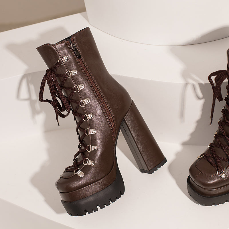 Looking for the perfect pair of boots to add a touch of edge to your outfit? Look no further than our brown platform boots! These lace-up beauties are made with high-quality materials and feature a 5.5'' block heel that will give you a boost of height without sacrificing comfort.
