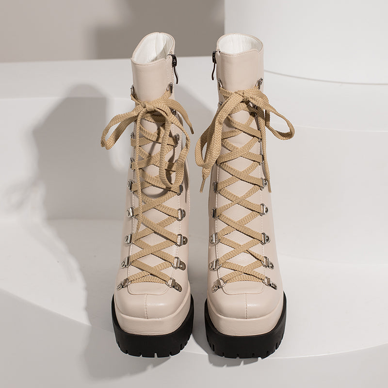 Looking for the perfect pair of boots to add a touch of edge to your outfit? Look no further than our beige platform boots! These lace-up beauties are made with high-quality materials and feature a 5.5'' block heel that will give you a boost of height without sacrificing comfort.