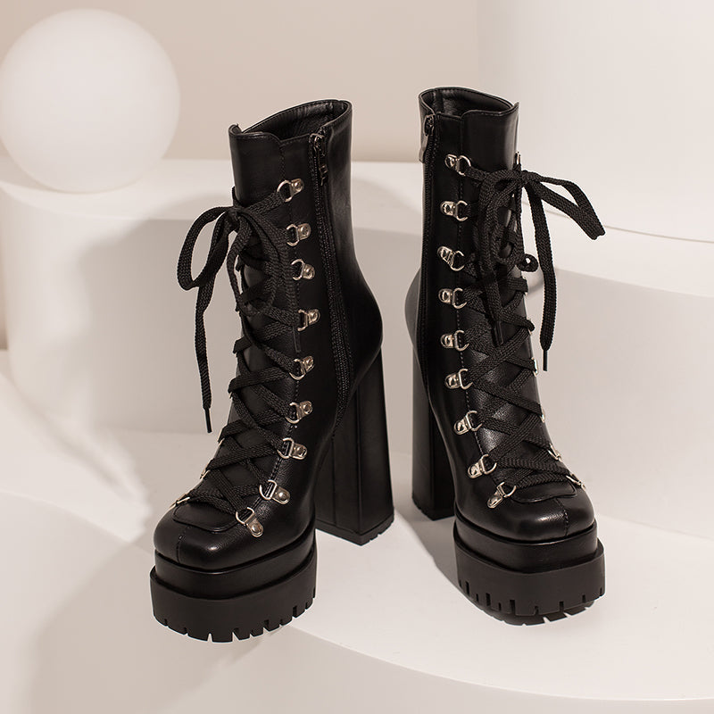 Looking for the perfect pair of boots to add a touch of edge to your outfit? Look no further than our black platform boots! These lace-up beauties are made with high-quality materials and feature a 5.5'' block heel that will give you a boost of height without sacrificing comfort.