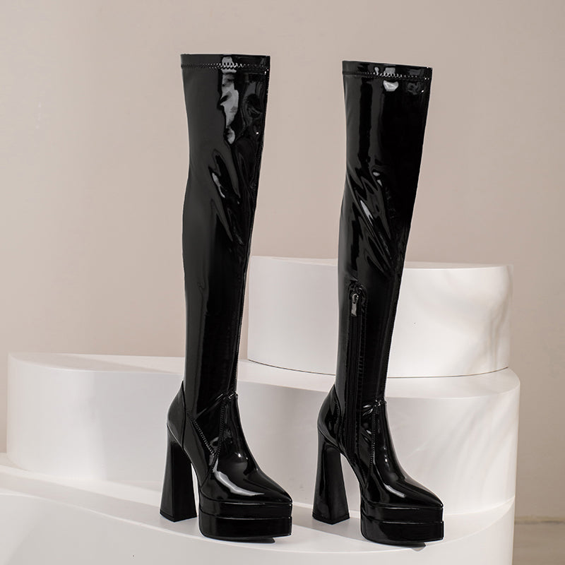 These black patent leather thigh high boots are the perfect addition to your fall wardrobe.