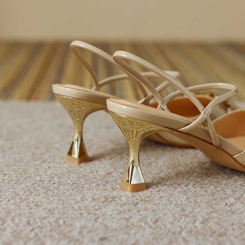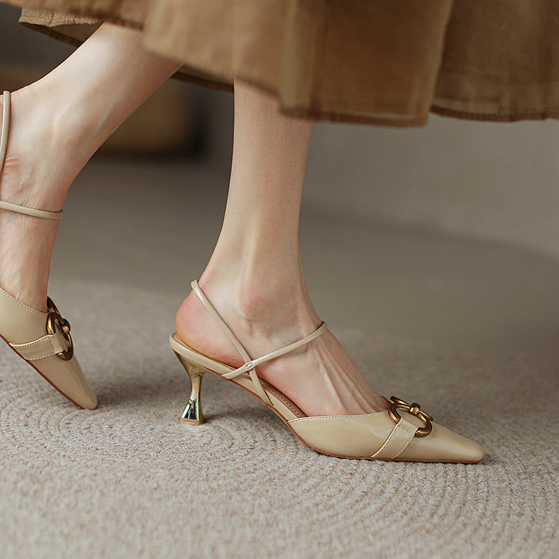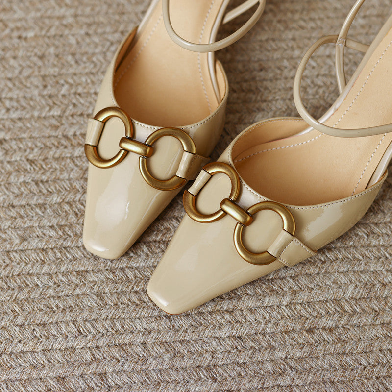 These nude kitten heels are the perfect addition to your wardrobe. With their square toe and slingback design. they are both stylish and comfortable. The patent leather gives them a sleek and polished look. while the gold chain adds a touch of glamour.