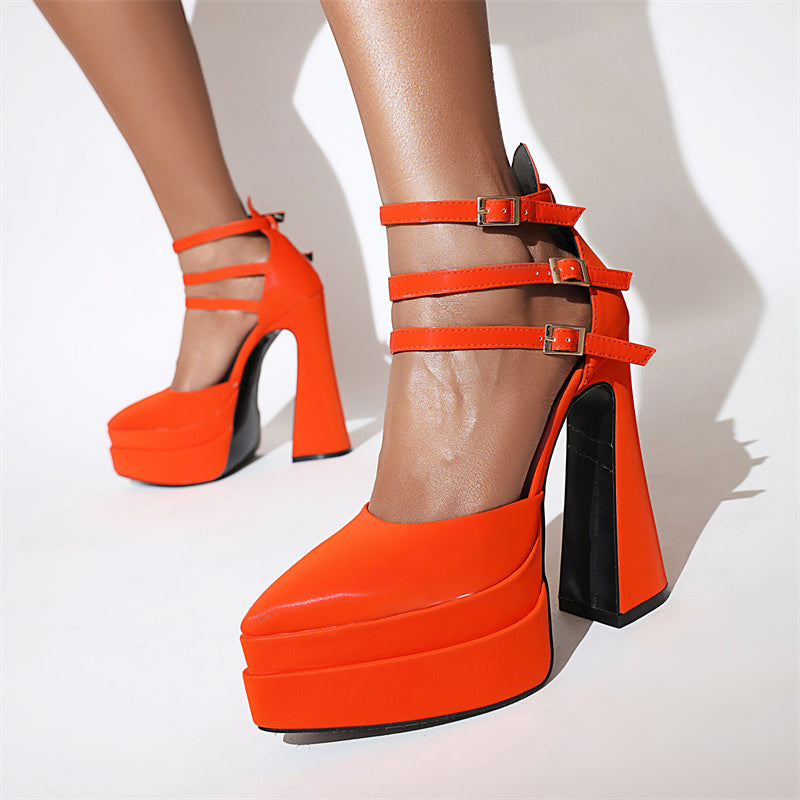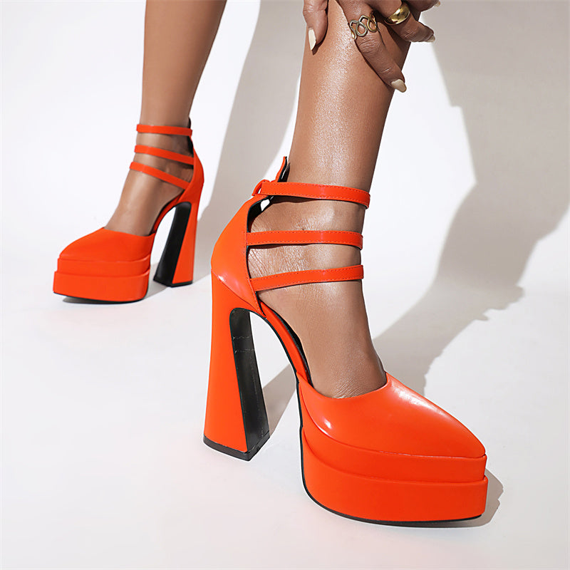 Introducing our orange platform heels! These beautiful shoes are perfect for any occasion. from a night out on the town to a special event. With their pointed toe and ankle strap. they are both stylish and comfortable. They also come in a variety of sizes so you can find the perfect fit.