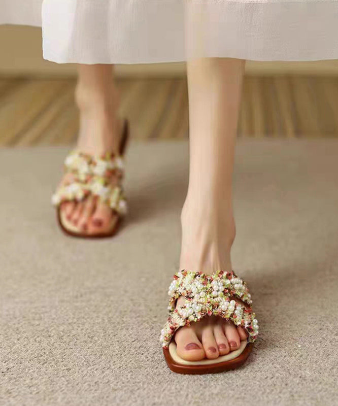 French Nail Bead Splicing Apricot Cowhide Leather Slide Sandals