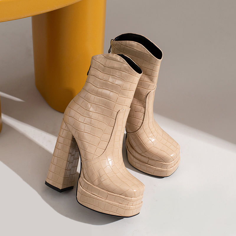 Who says you can't have it all? Our nude ankle boots combine style and comfort into one must-have package. The square toe and block heel give you a timeless look that you can wear again and again. while the platform and embossed leather add a touch of luxury. Whether you're dressing up for a night out or just errands around town. these boots will keep you looking and feeling your best.