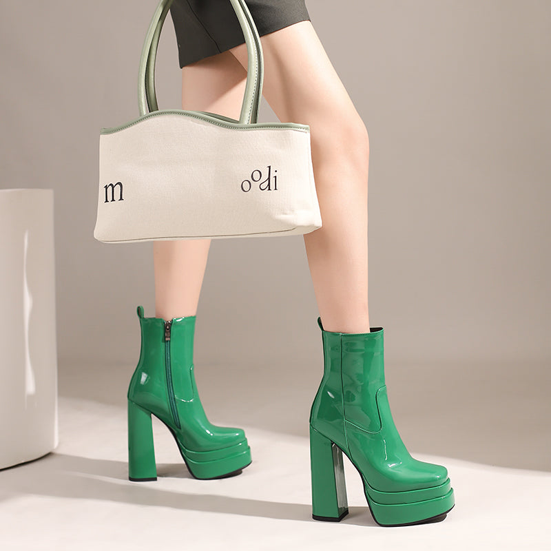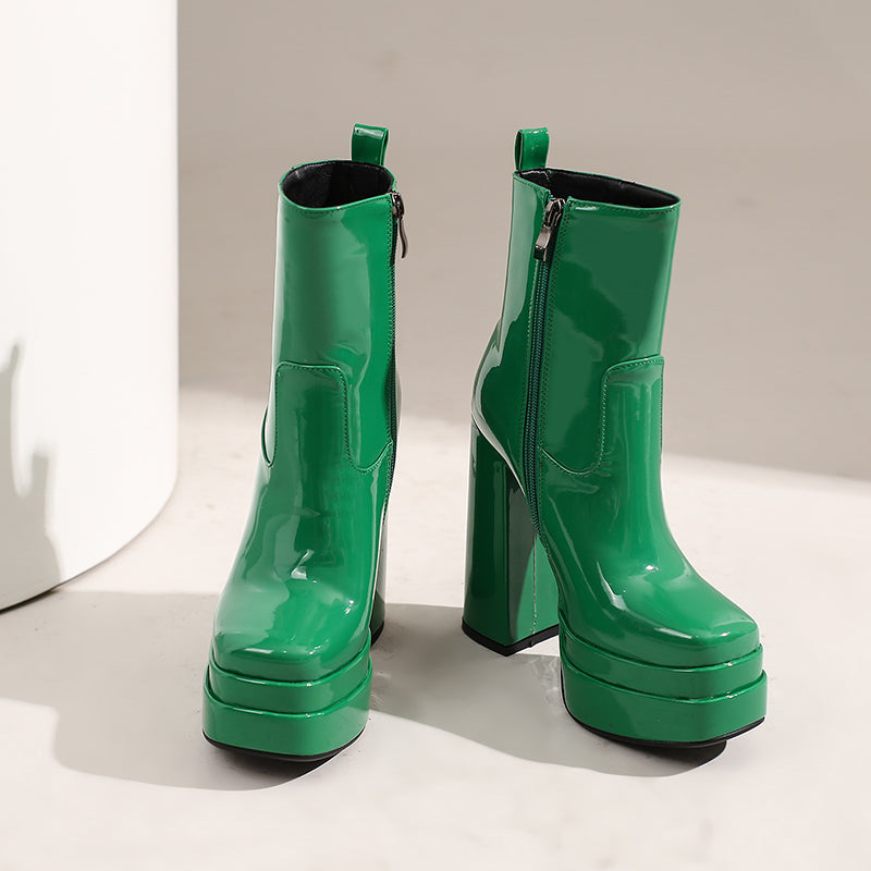 Introducing our newest arrivals ââ‚?the Green Platform Boots! A chic and stylish twist on the classic platform boot. these square-toe beauties are perfect for making a statement. The lush patent leather and chunky block heel add a touch of luxury. while the green hue is perfect for standing out from the crowd.