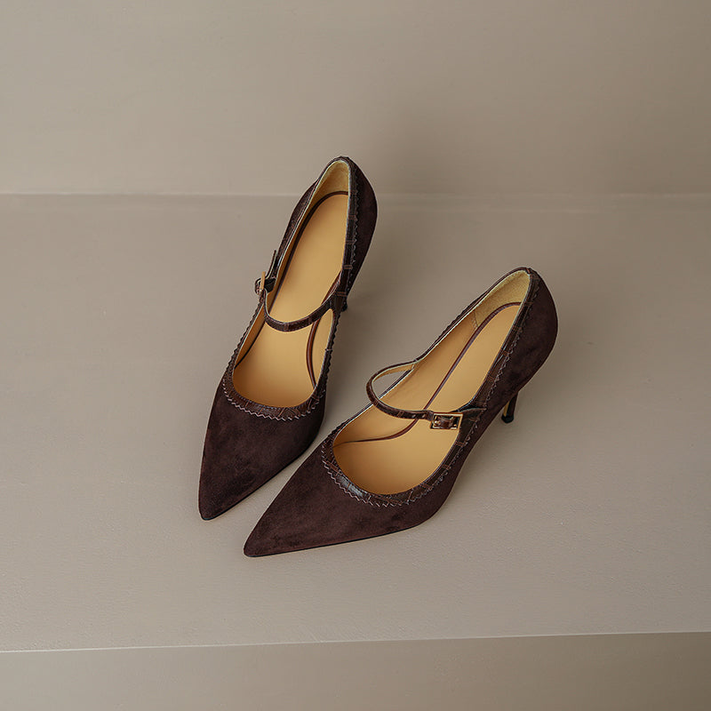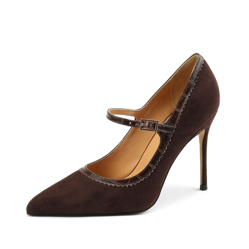 Introducing our newest arrival of brown mary jane heels! This style features a pointed toe. soft suede material. and 4'' stiletto heel. You'll love the way you look and feel in these shoes! They are perfect for any occasion. whether you're dressing up for a night out or just want to add a touch of elegance to your everyday look.
