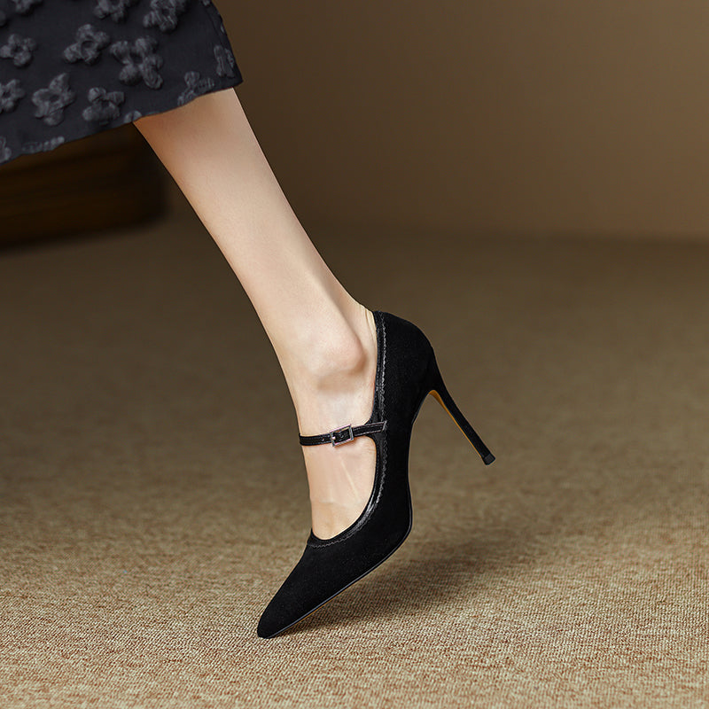 Create a look that's all your own with a pair of stylish black stiletto heels. These unique shoes feature a pointed toe and are made from soft. suede material. They're perfect for dressing up or down. and they'll make you look and feel amazing no matter where you wear them.