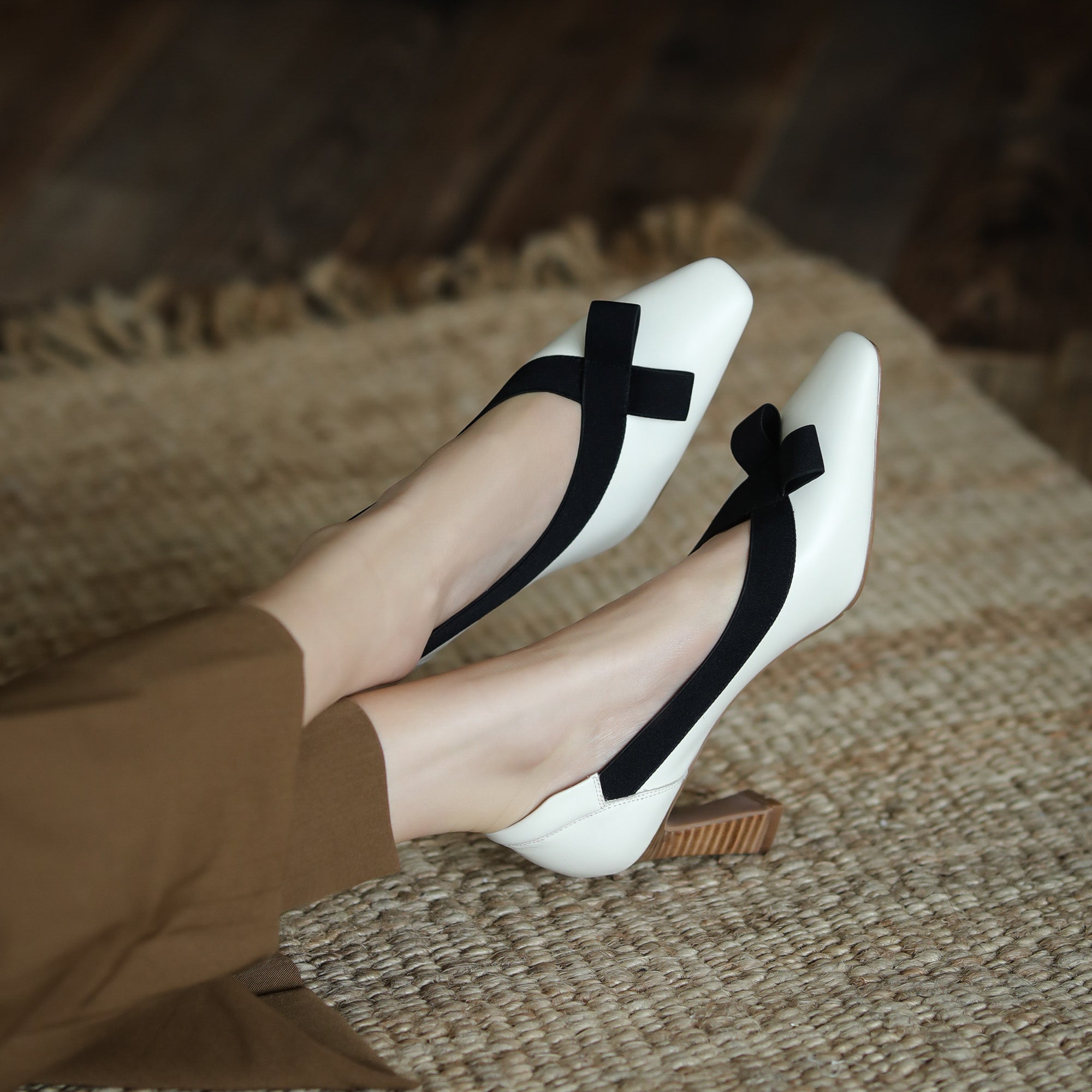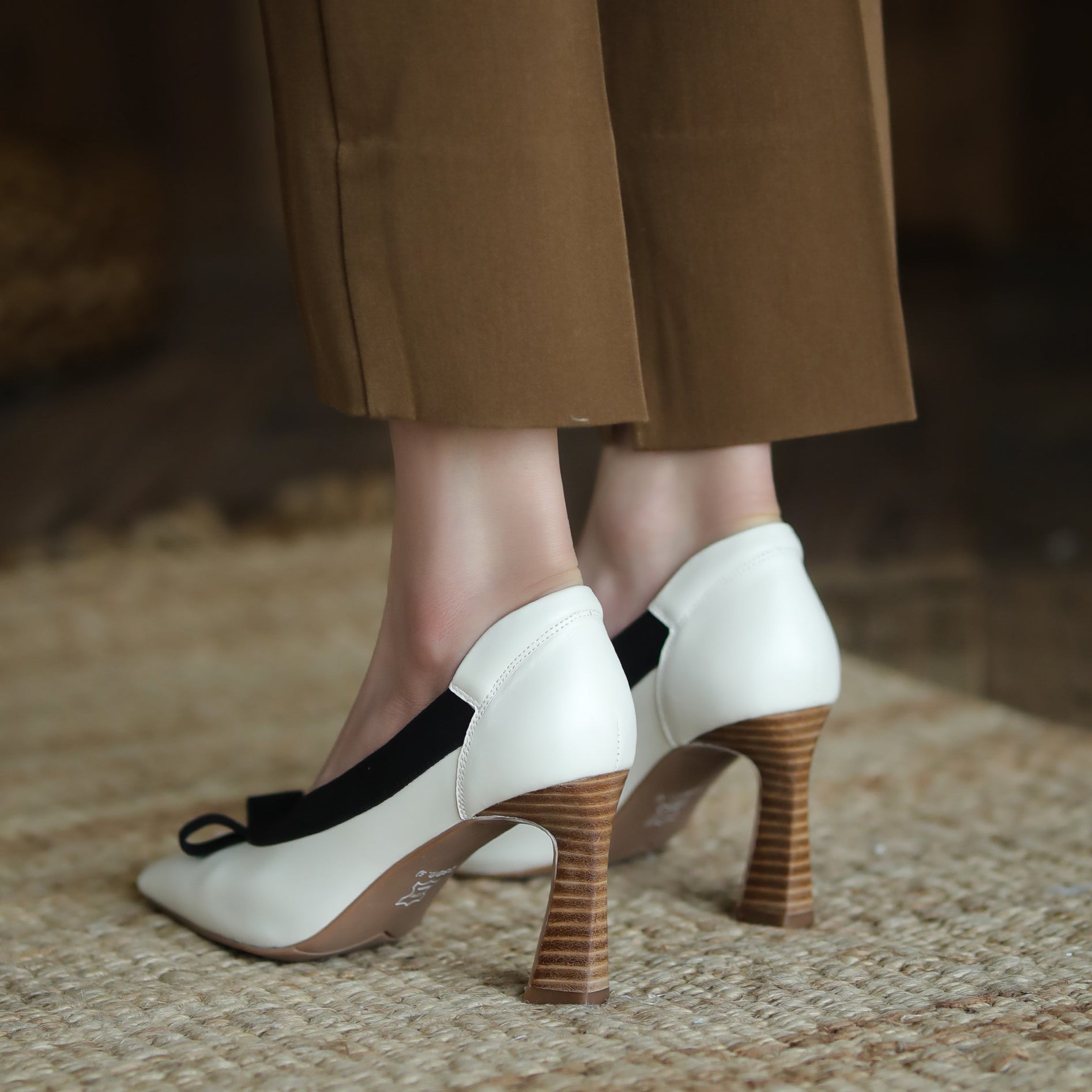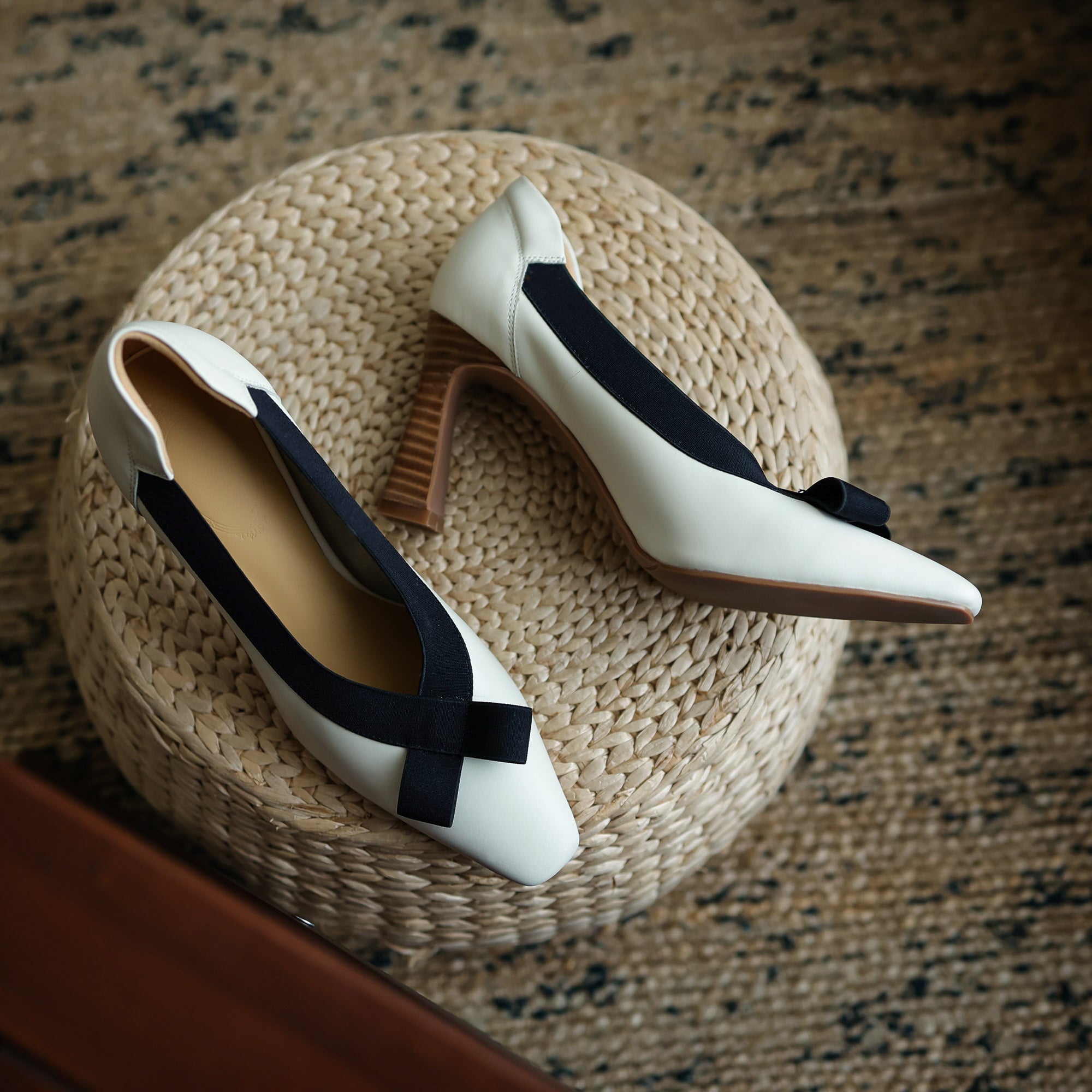 These white bow heels are the perfect combination of sweet and sassy! The square toe gives them a bit of edge. while the leather construction keeps them looking chic and sophisticated. And the 3'' heel is just the right height to give you a little boost without being too uncomfortable. Whether you're dressing up for a night out or just want to add a touch of femininity to your everyday look. these shoes are a must-have!
