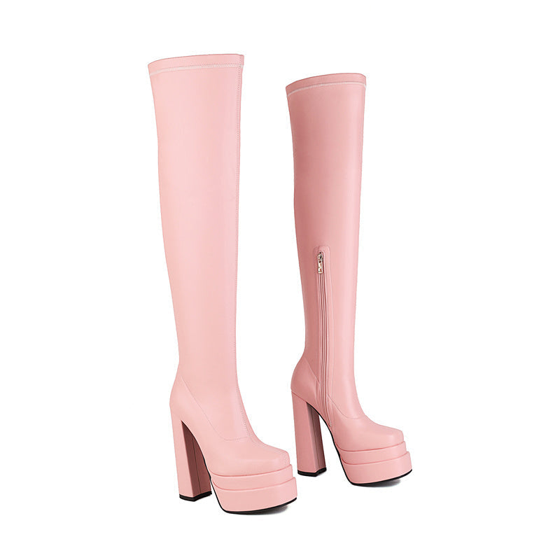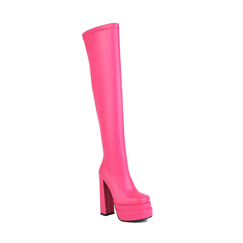 Looking for something to really turn heads? Then check out our pink thigh high boots! These babies are sure to get you noticed with their peep toe and block heel design. Plus. the platform makes them super comfy to wear all night long. Whether you're hitting the club or just want to add a little spice to your outfit. these boots are perfect for you!