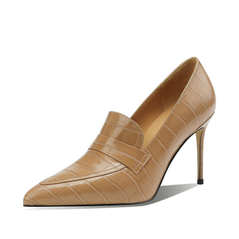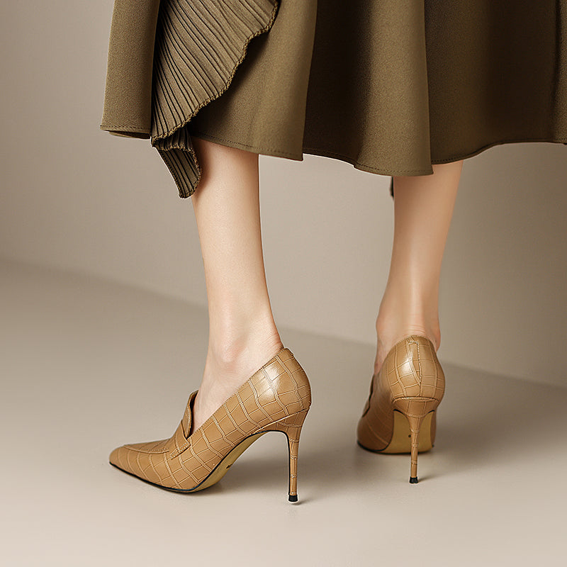 Looking for something a little different in your footwear wardrobe? Check out our fabulous loafer heels! These stylish shoes feature a pointed toe and a sleek leather design. all set on a 3.5'' heel. Perfect for dressing up or down. they come in a beautiful apricot color that is sure to turn heads.