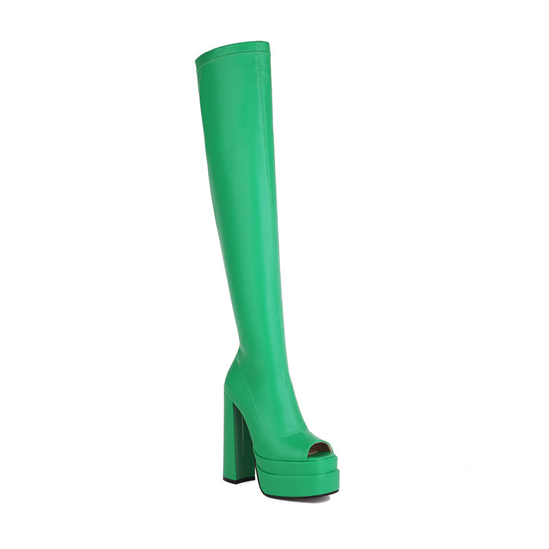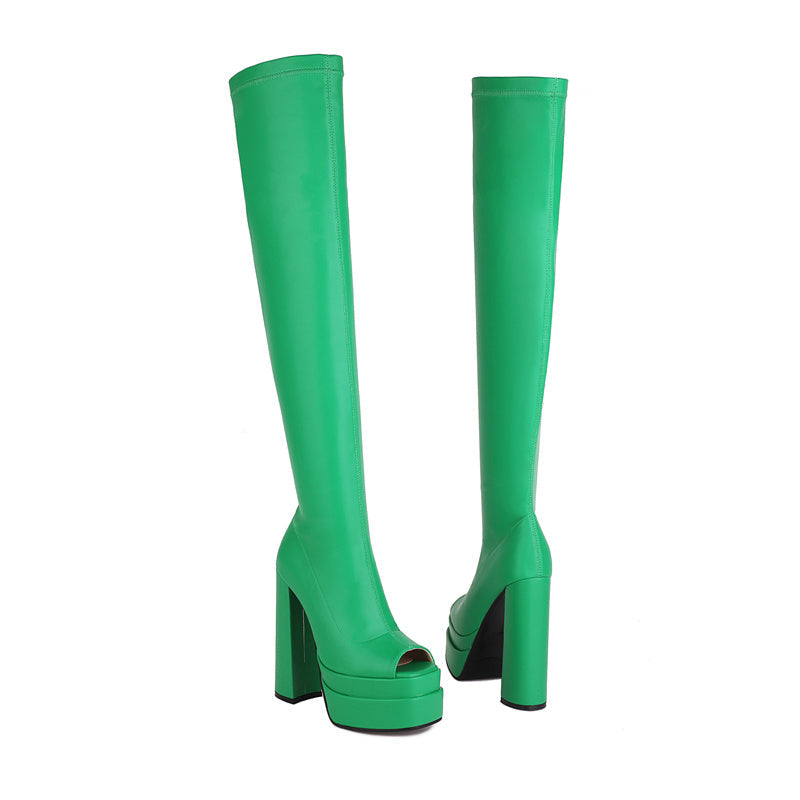 Looking for a fashion-forward and unique boot that will turn heads? Look no further than our gorgeous green thigh high boots! These stylish boots feature an open toe design and platform block heels for a look that's both fashionable and comfortable. Whether you're dressing up for a night out or just looking to add a pop of color to your outfit. these boots are sure to make a statement.