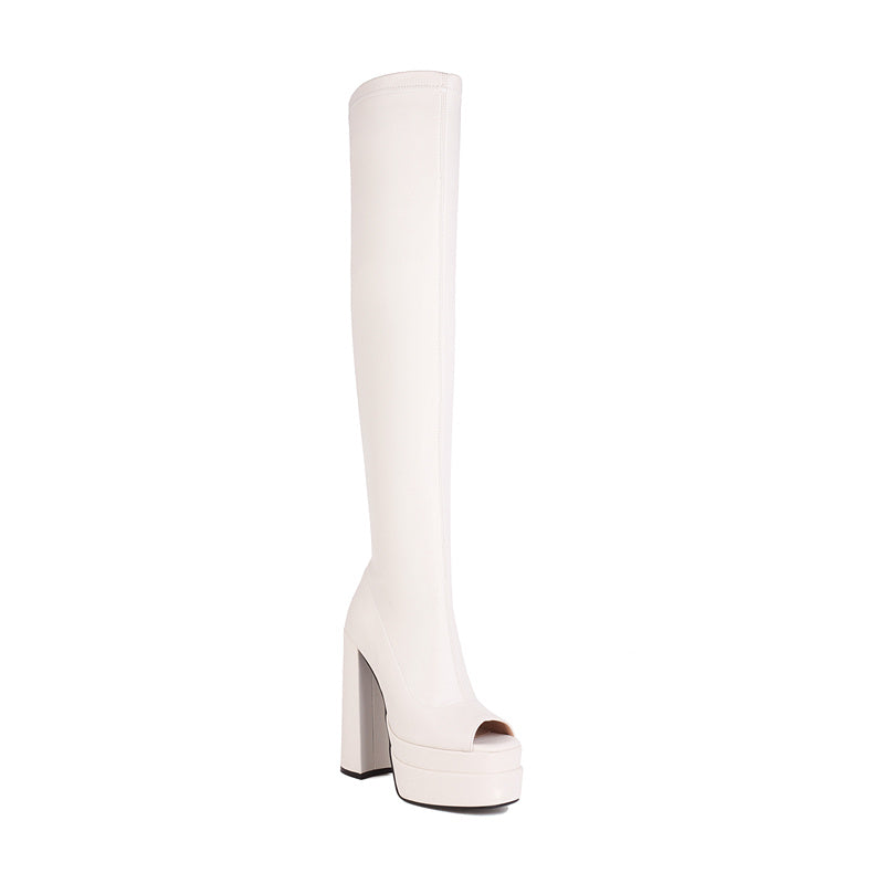 Looking for something sexy and stylish to wear out on the town? Check out our white thigh high boots! These beauties are sure to turn heads with their open toe design and platform heels. Whether you're hitting the dance floor or strutting your stuff down the street. you'll look fabulous in our white thigh high boots!