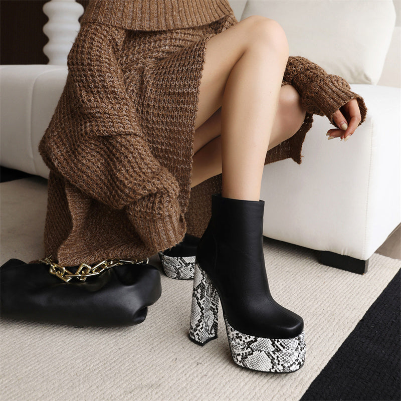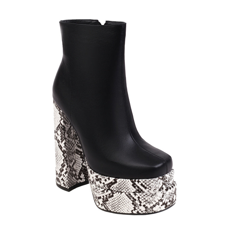 Introducing our newest arrivals: the trend-setting black and white boots. These stylish boots are made with a snake print design and feature a platform and block heel for added appeal. Perfect for dressing up or down. these ankle boots are a must-have in your wardrobe. Add them to your favorite jeans and a top for a casual look or pair them with a dress or skirt for a night out. Whatever the occasion. you'll be sure to turn heads in these head-turning boots!