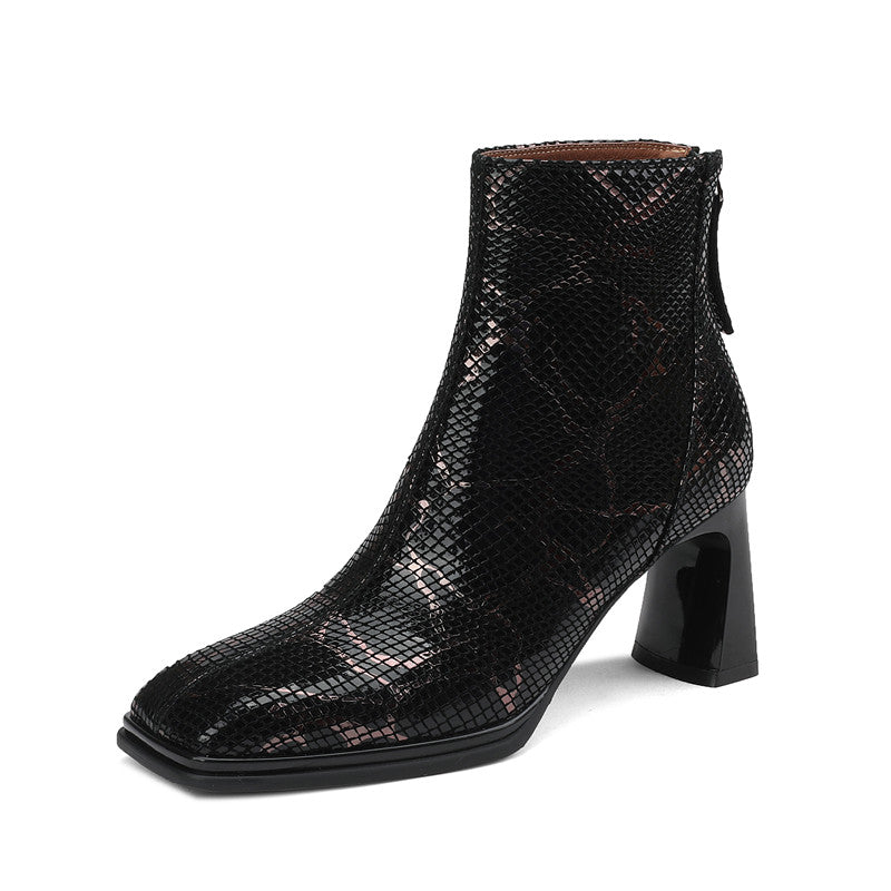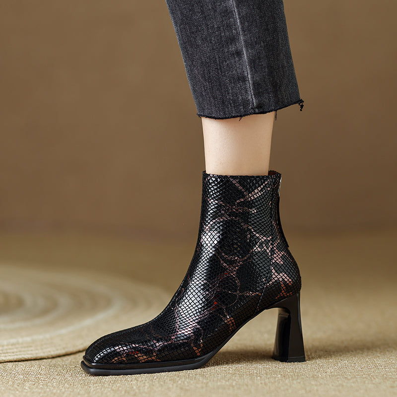 These snakeskin ankle boots are the perfect addition to any wardrobe. Made from genuine leather. they boast a square toe and 3'' block heels. They are also available in black. making them the perfect match for any outfit. Whether you're dressing up for a night out or just looking to add a touch of edge to your everyday look. these boots are sure to do the trick. So don't wait any longer. order your pair today!