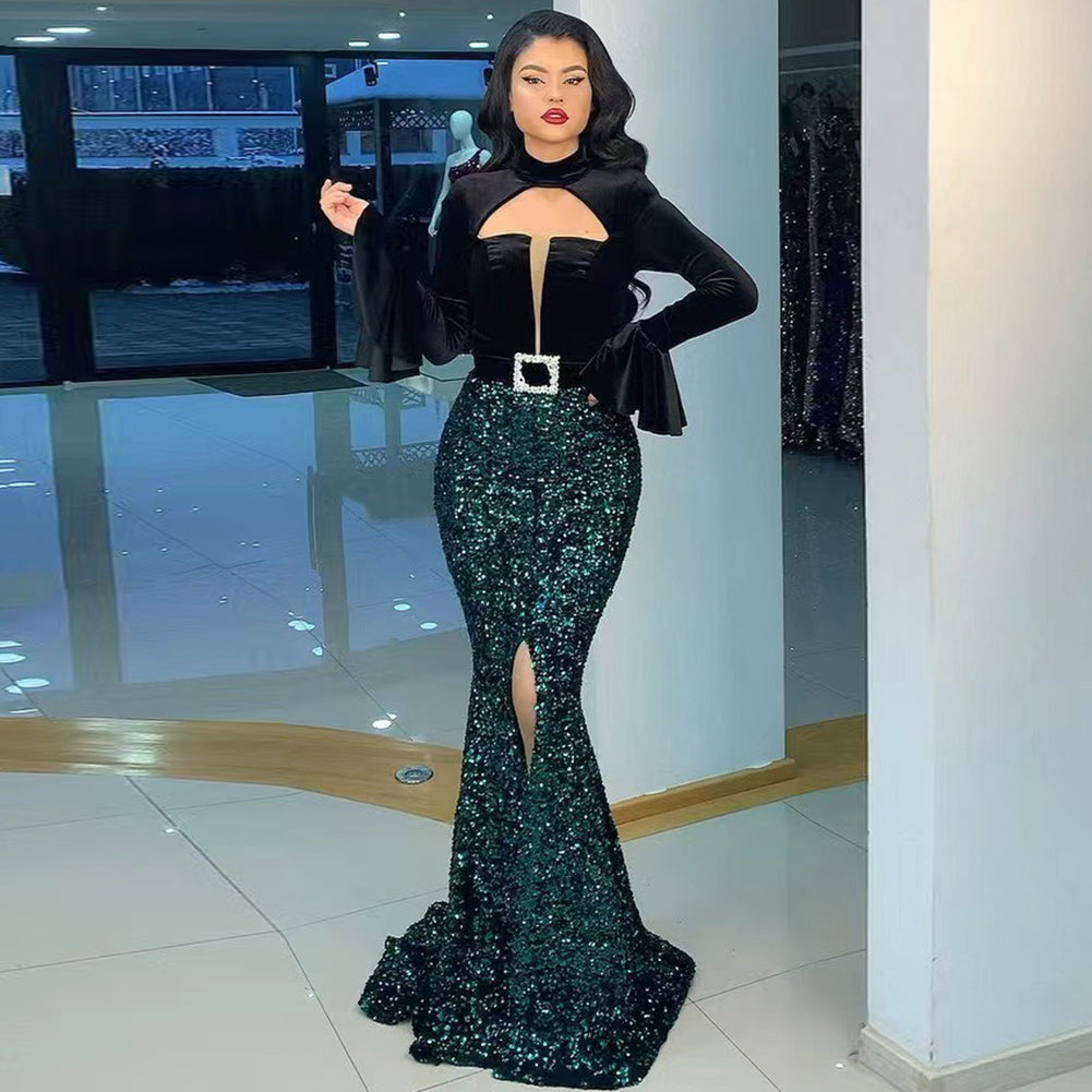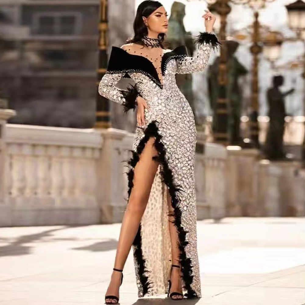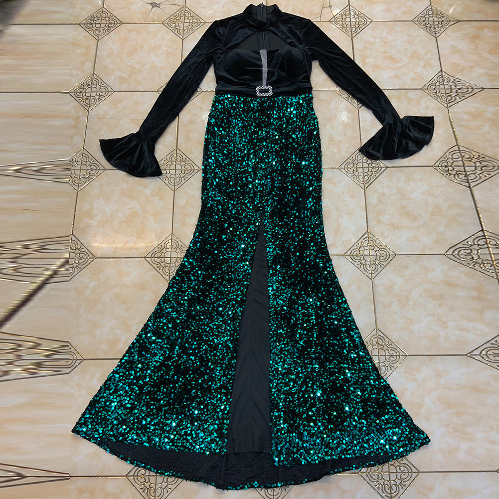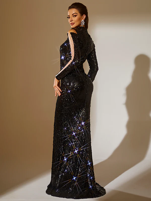 High Neck Long Sleeve Maxi Sequined Bodycon Dress