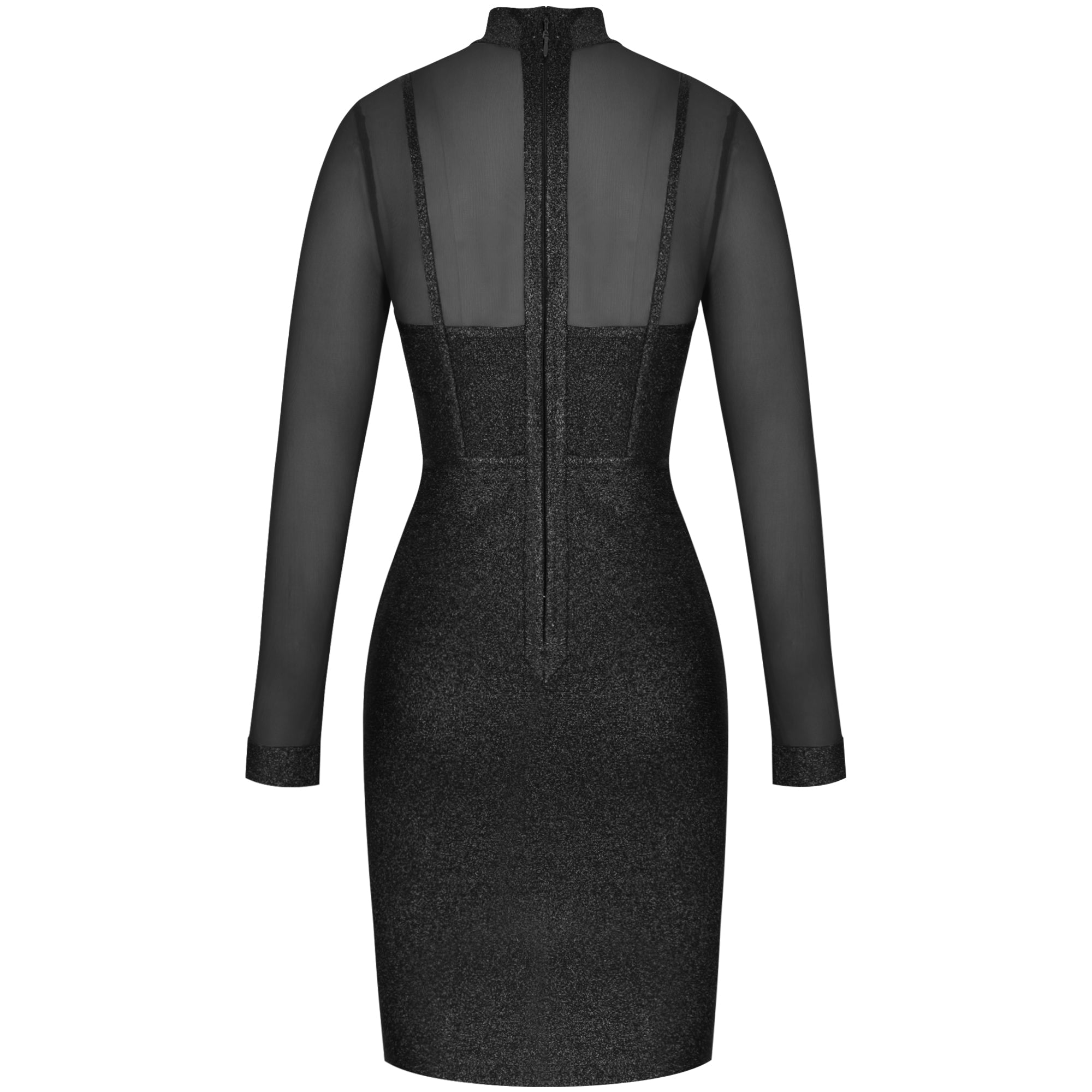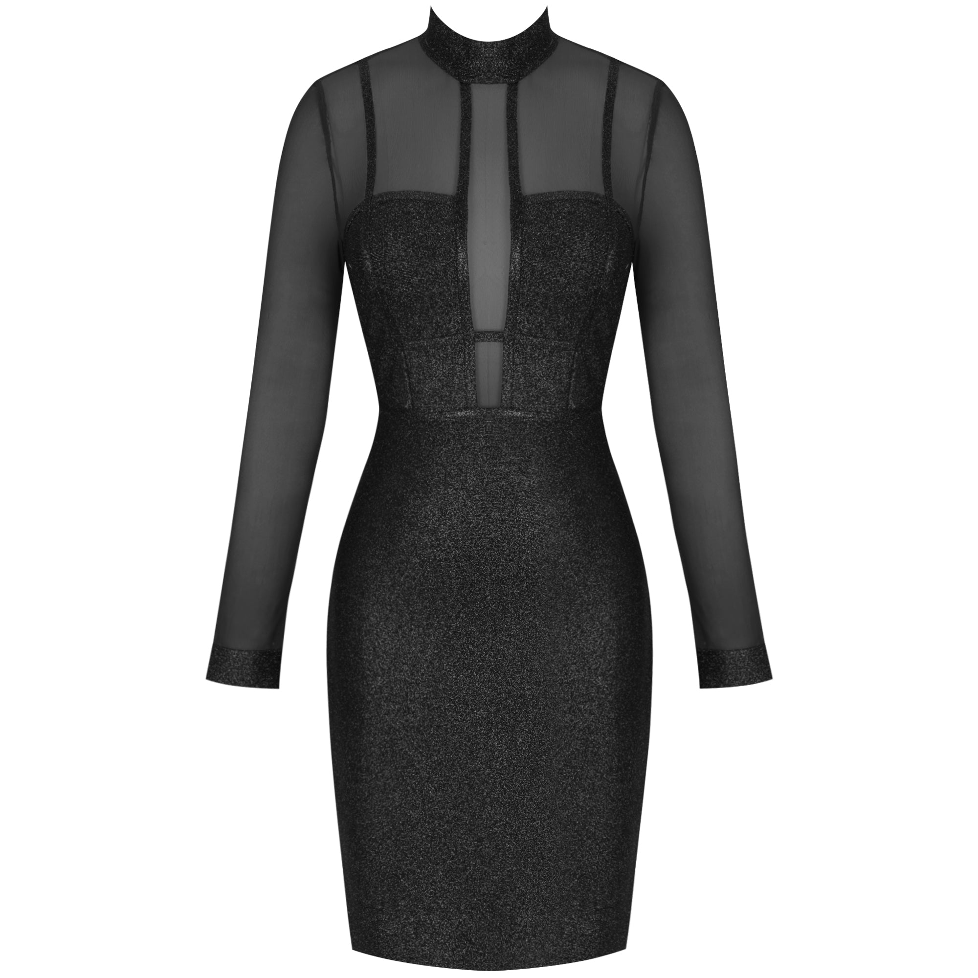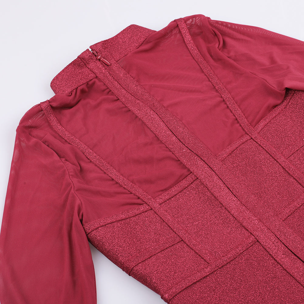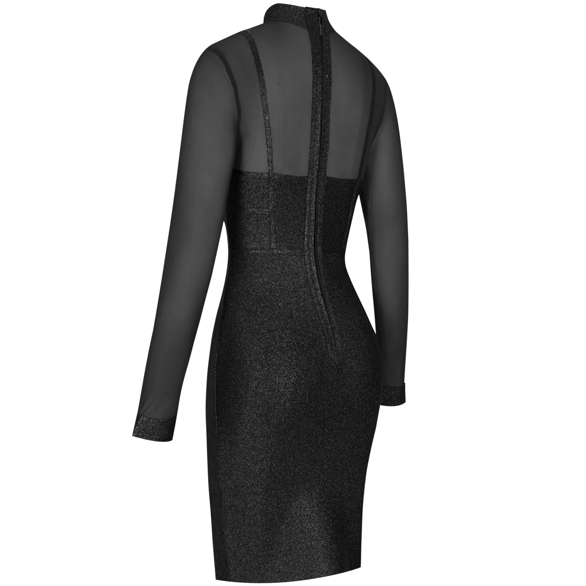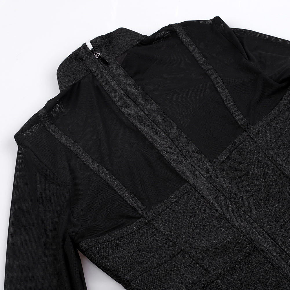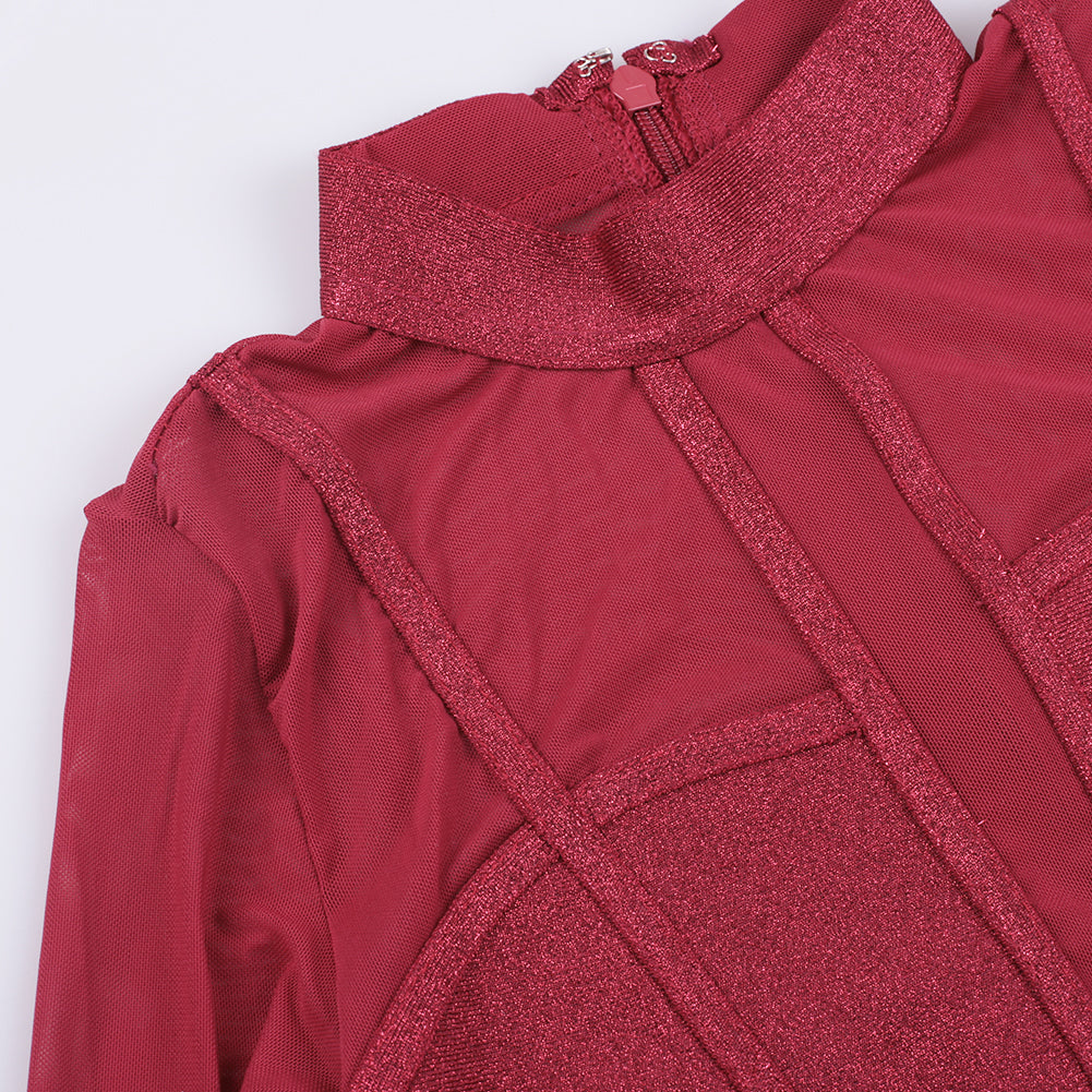 High Neck Long Sleeve Mesh Midi Bandage Dress