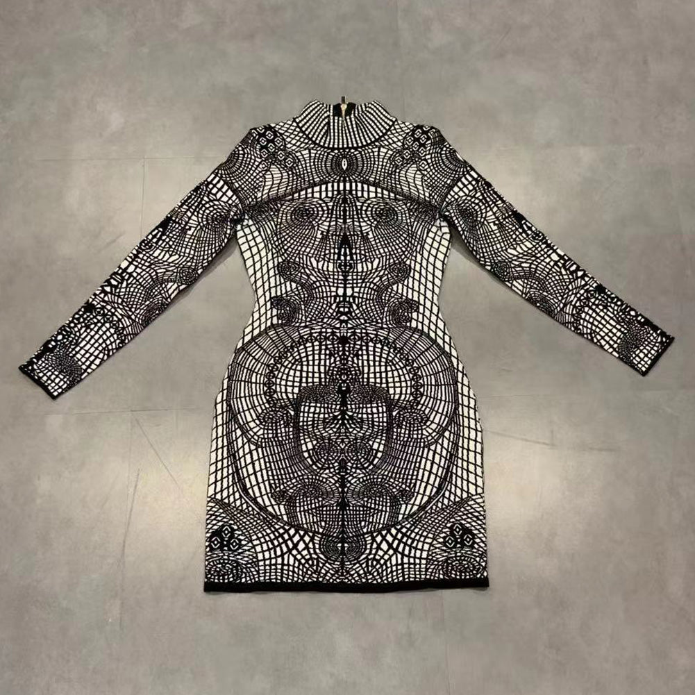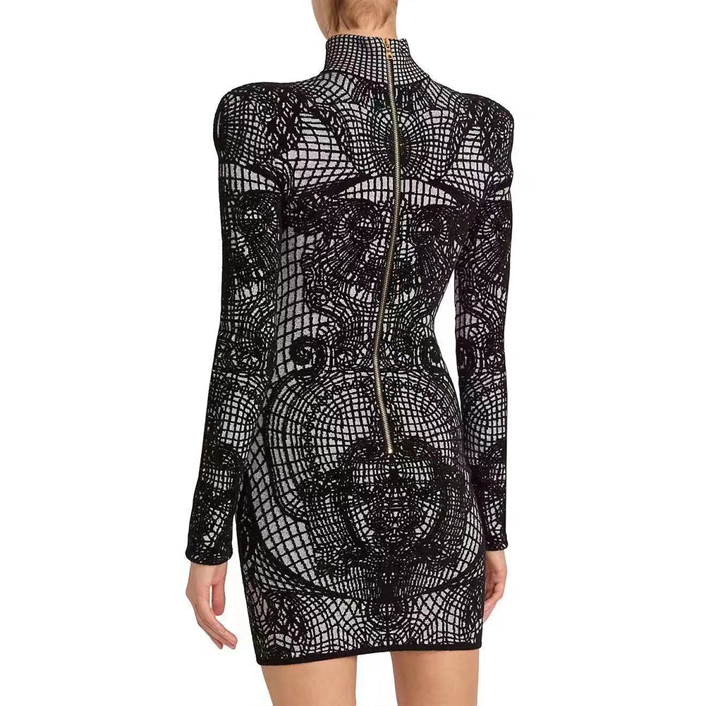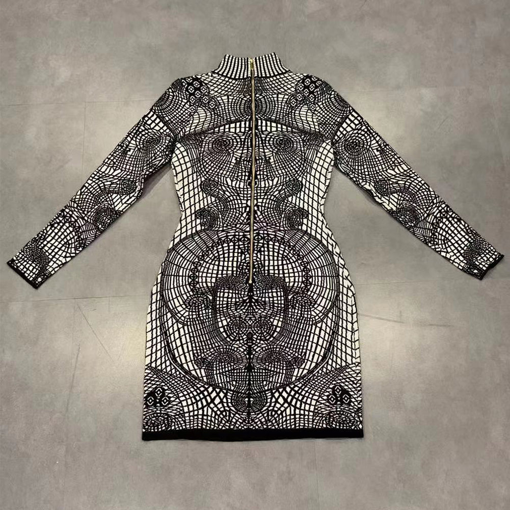 High Neck Long Sleeve Mini Plaid Bodycon Dress