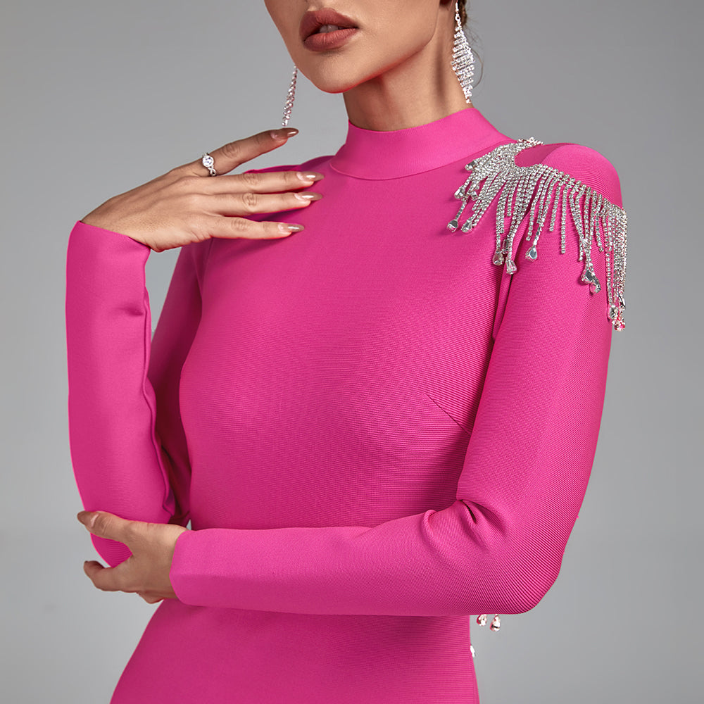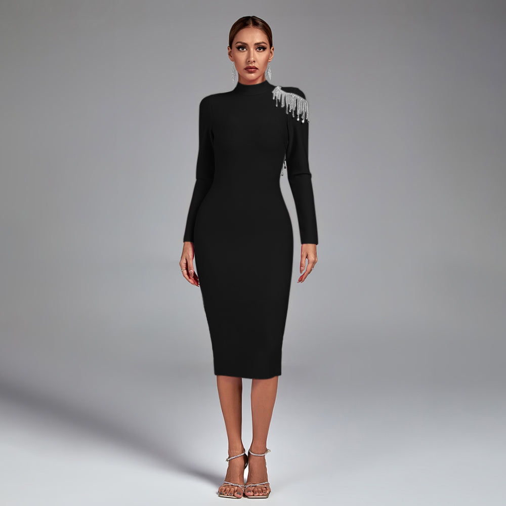 This High Neck Backless Tassels Bandage Dress is designed for all occasions. It features a high neck and backless design. with an intricate tasseled pattern ensuring a secure fit. Crafted from stretchable. breathable fabric. it's ideal for day-long comfort and confidence.