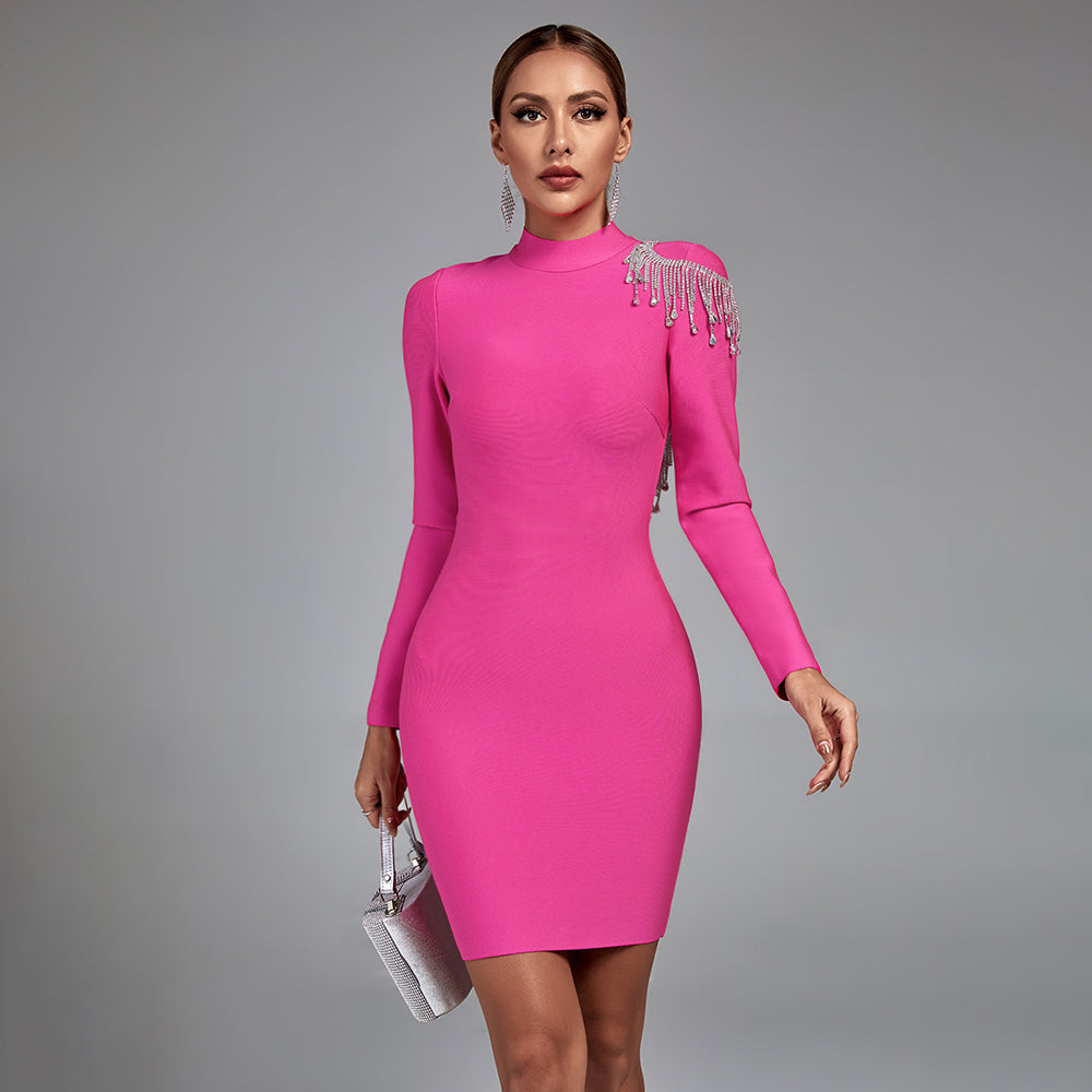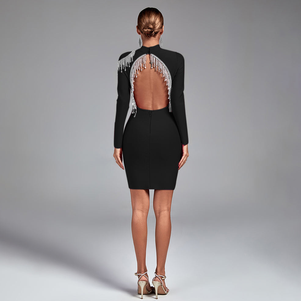 Dazzle your way into the room with this Rhinestone Fringe Backless Bandage Dress! Perfect for any occasion. this dress is sure to make a statement of luxury and glam. The body-hugging fit and blinged-out details will have heads turning - after all. it's impossible to go wrong with a little glitz and glam!