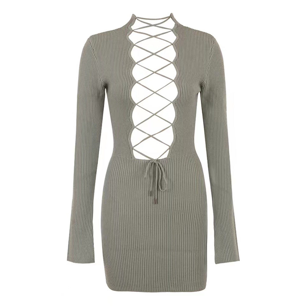 High Neck Long Sleeve Tie Mini Bodycon Dress