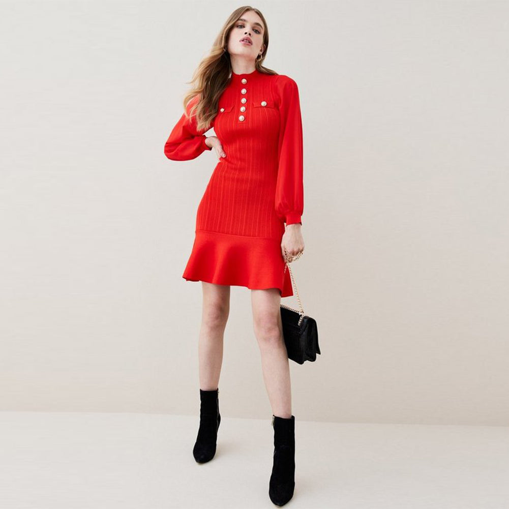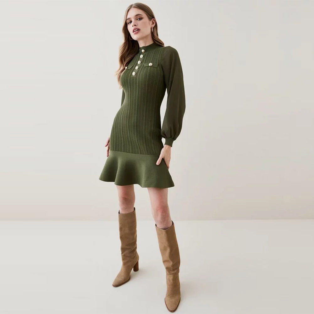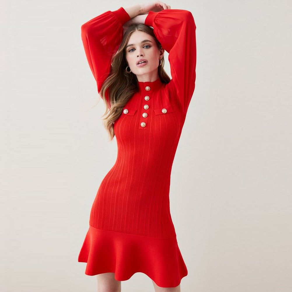 High Neck Metal Ornamental Buckle Mini Bandage Dress