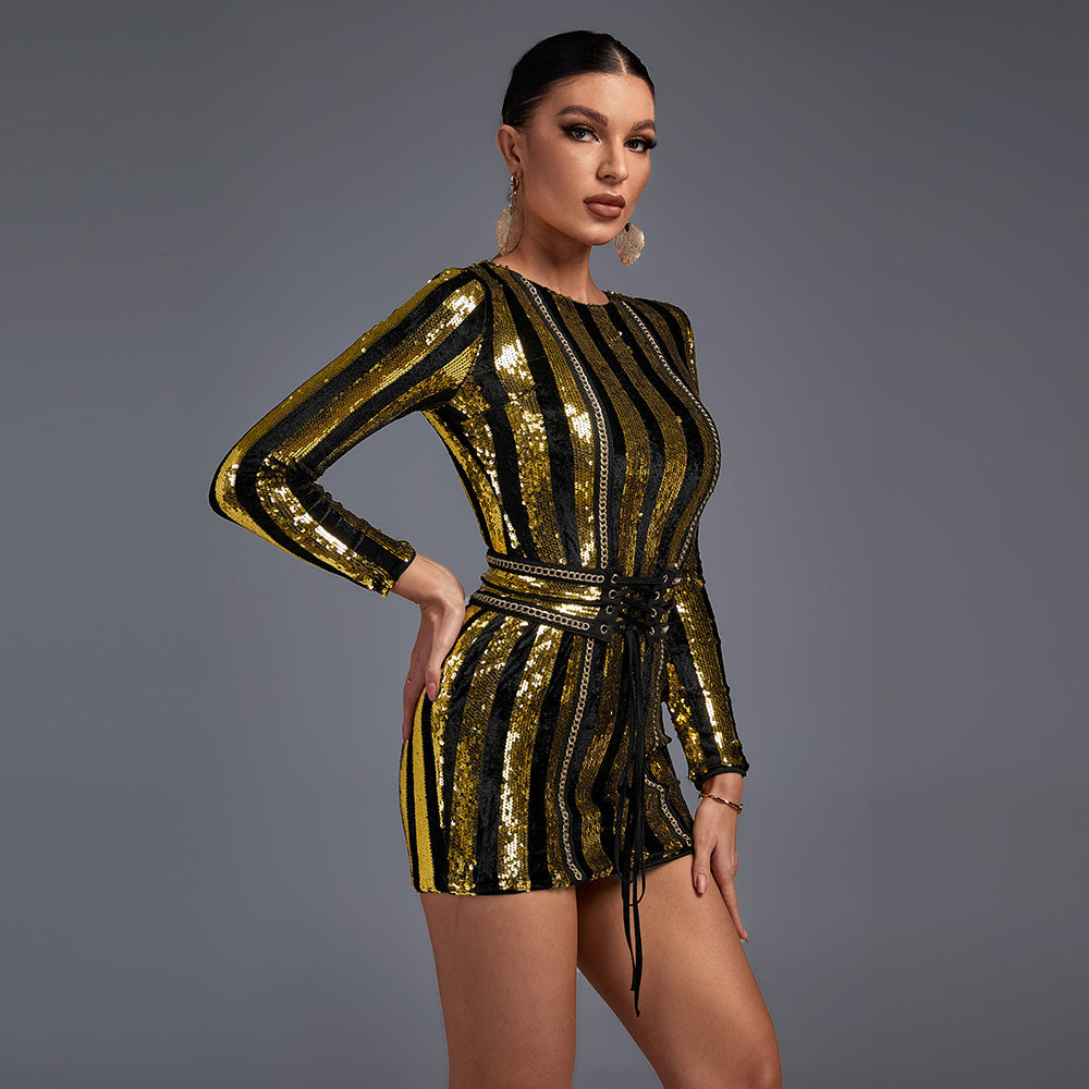 Round Neck Long Sleeve Sequined Mini Bodycon Dress