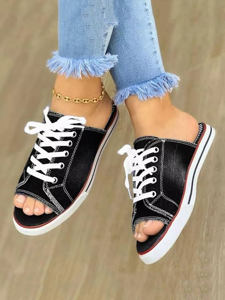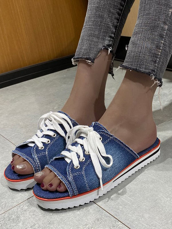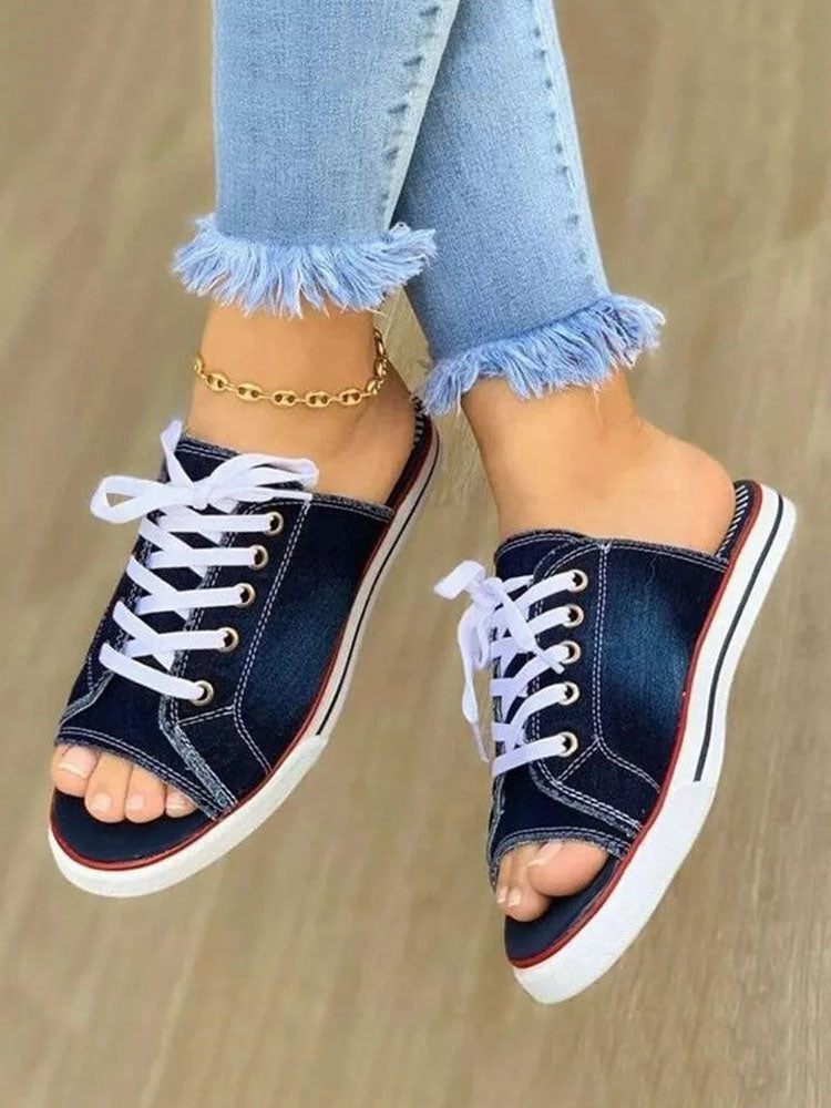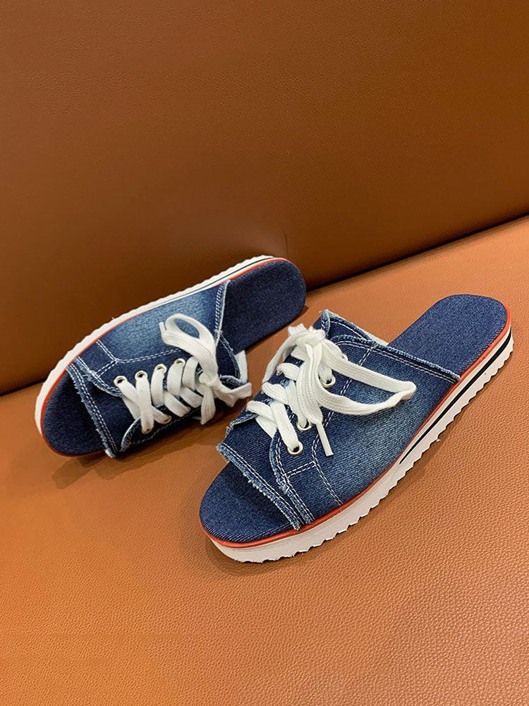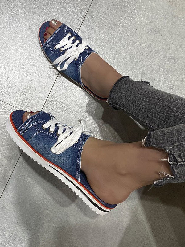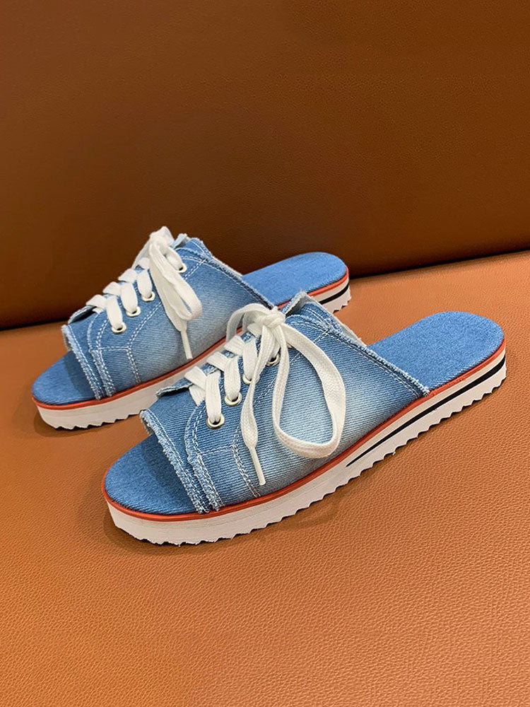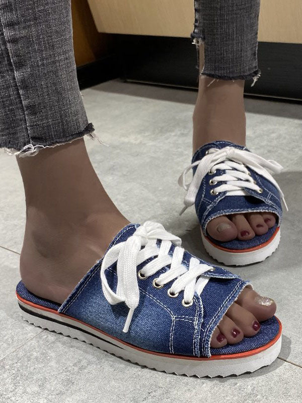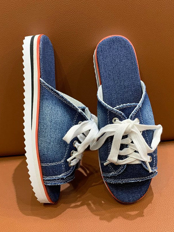 Lace Up Denim Flat Slippers