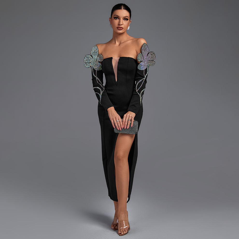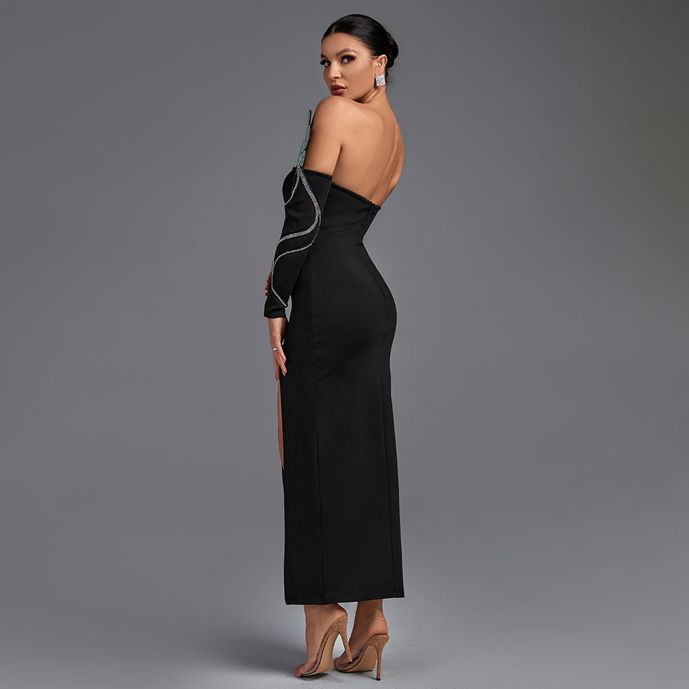 Off Shoulder Long Sleeve Maxi Rhinestone Bandage Dress