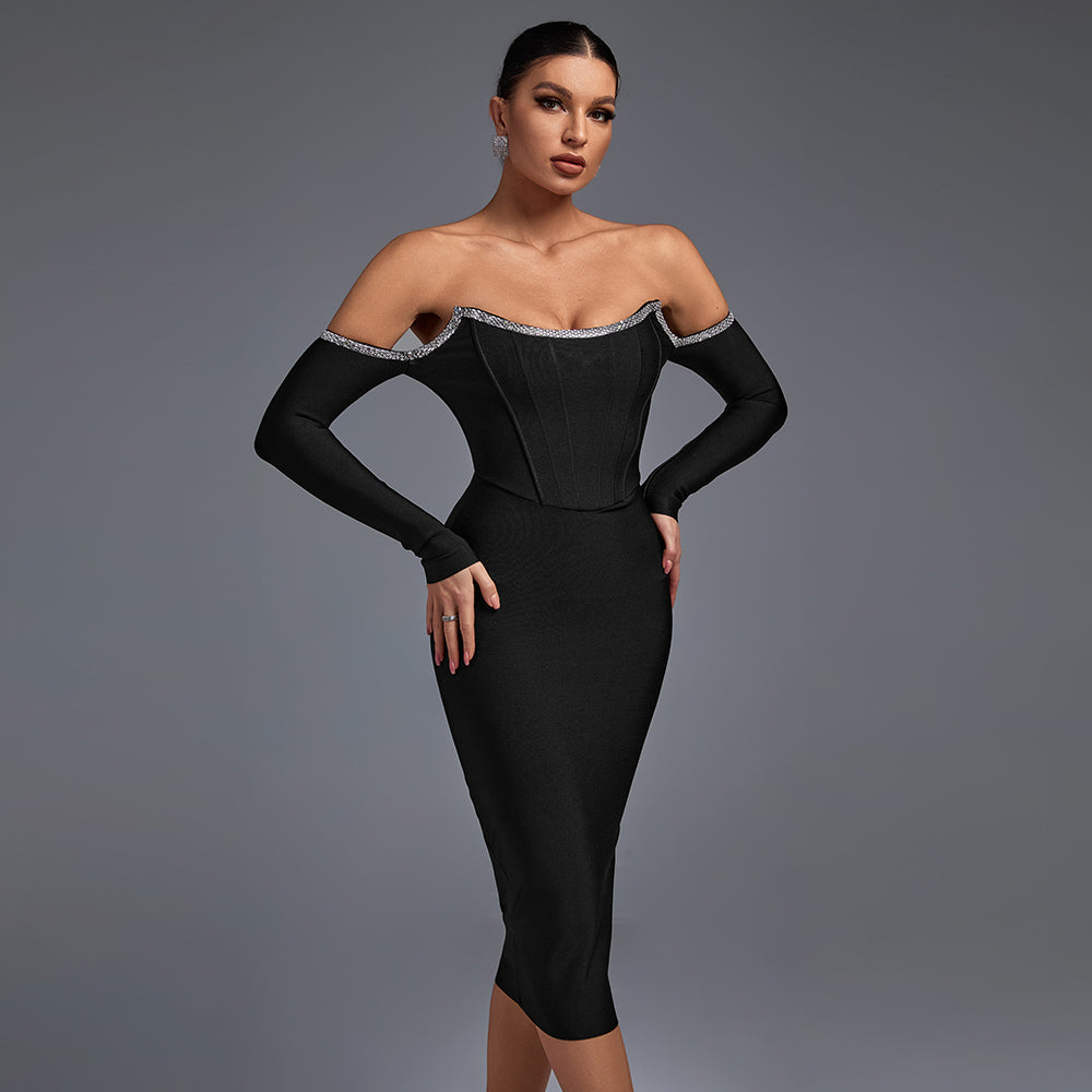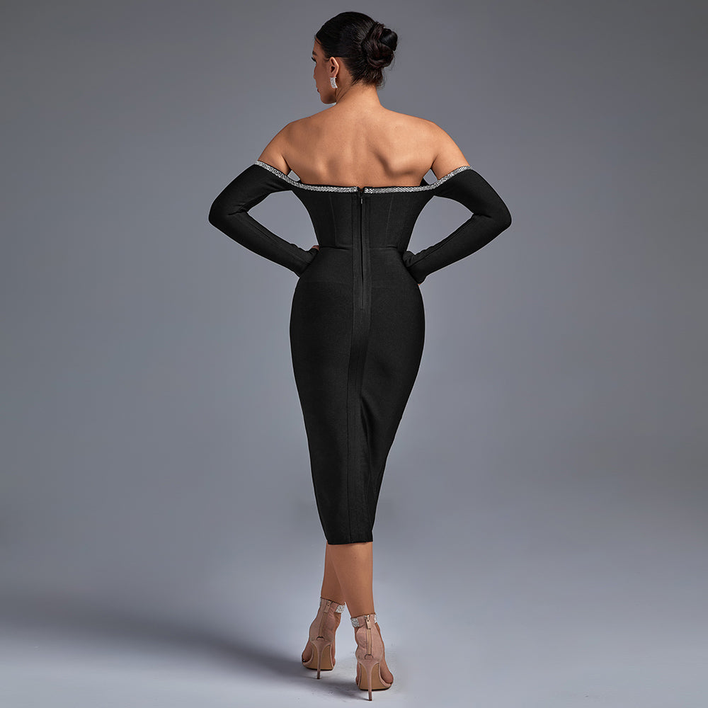 Off Shoulder Rhinestone Midi Bandage Dress
