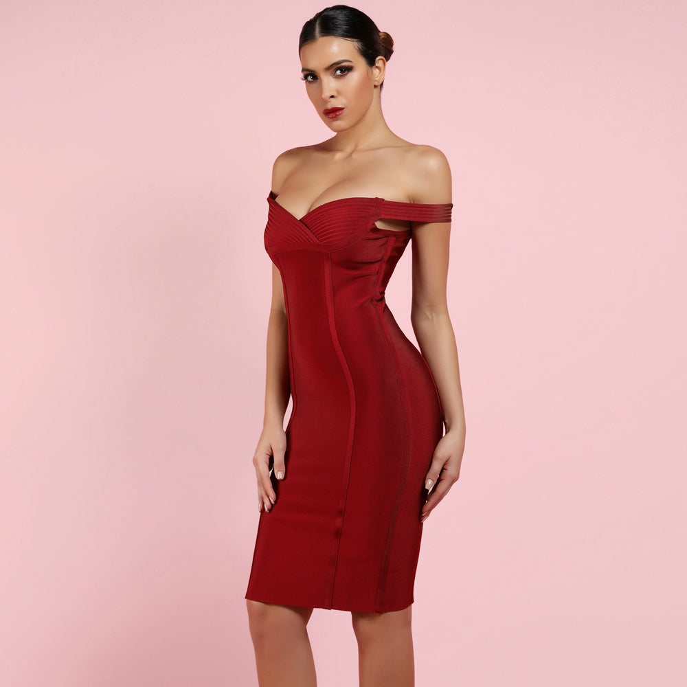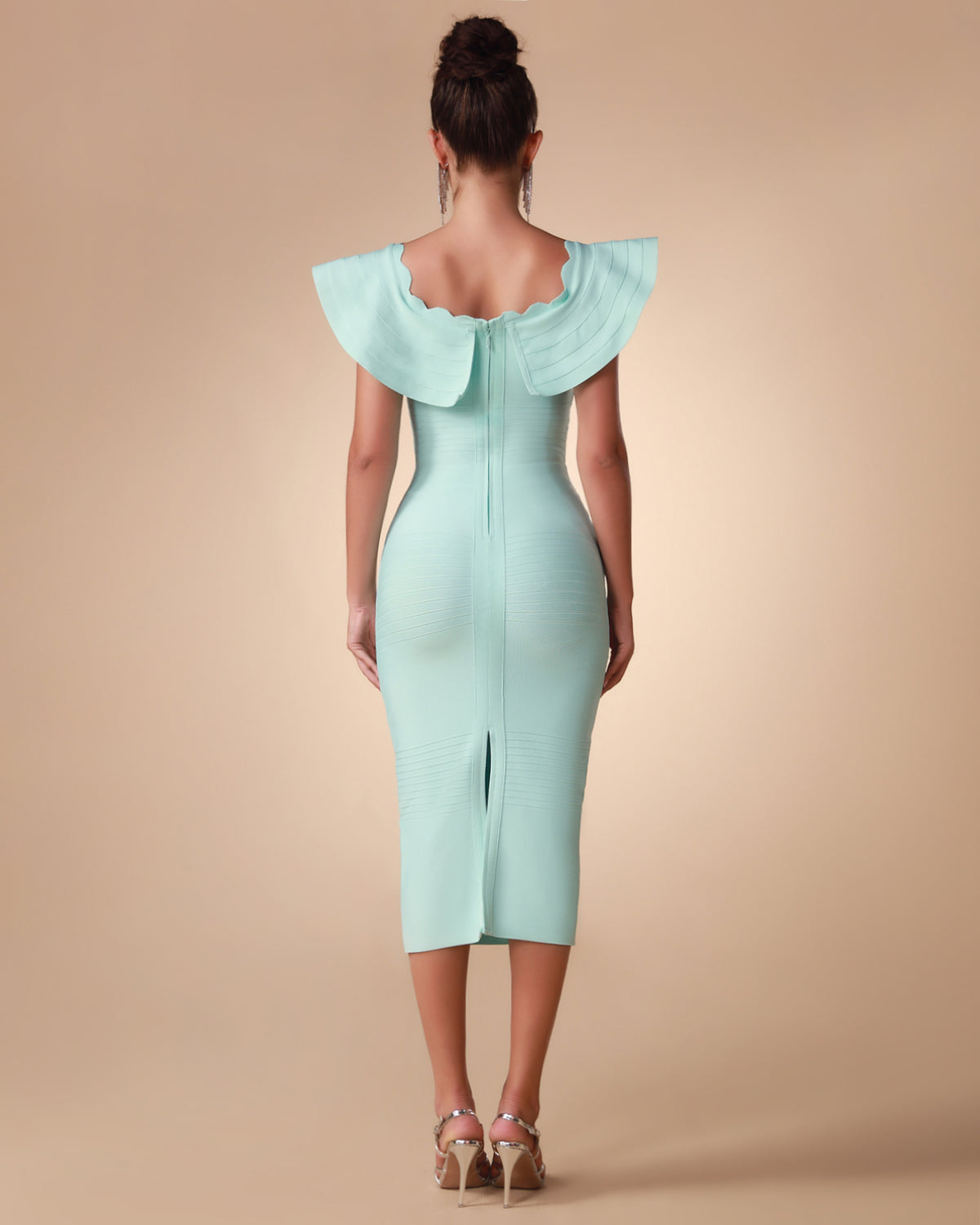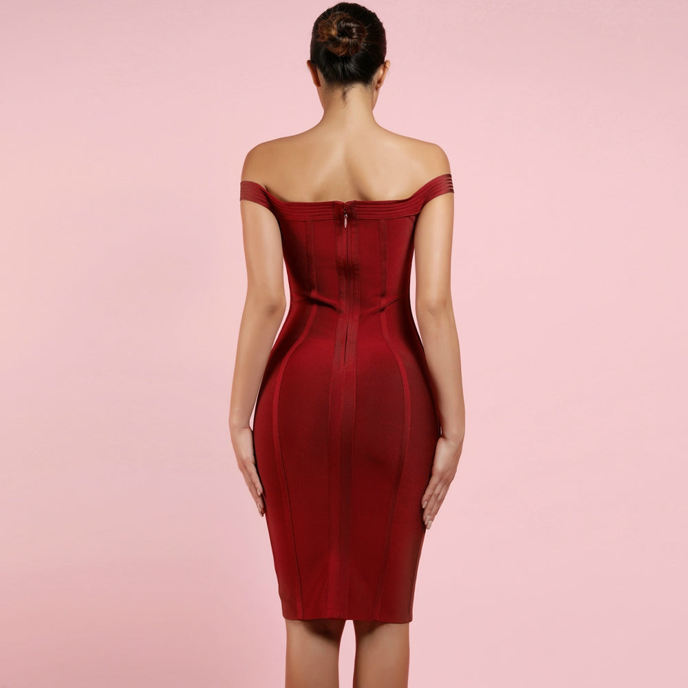 Turn heads in this stunning Off Shoulder Midi Bandage Dress. Featuring an off-shoulder design. scalloped edges and a body-hugging fit. this beautiful dress is perfect for any special occasion. Make an entrance in this captivating piece.