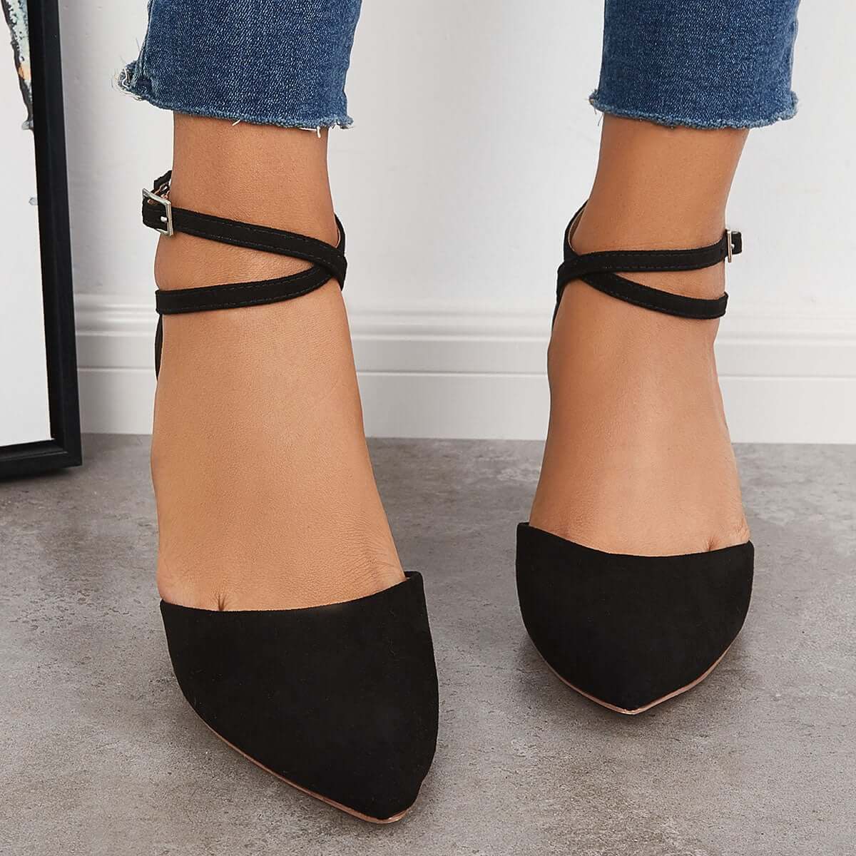 Features: Pointed toe block low heel. ankle buckle strap type