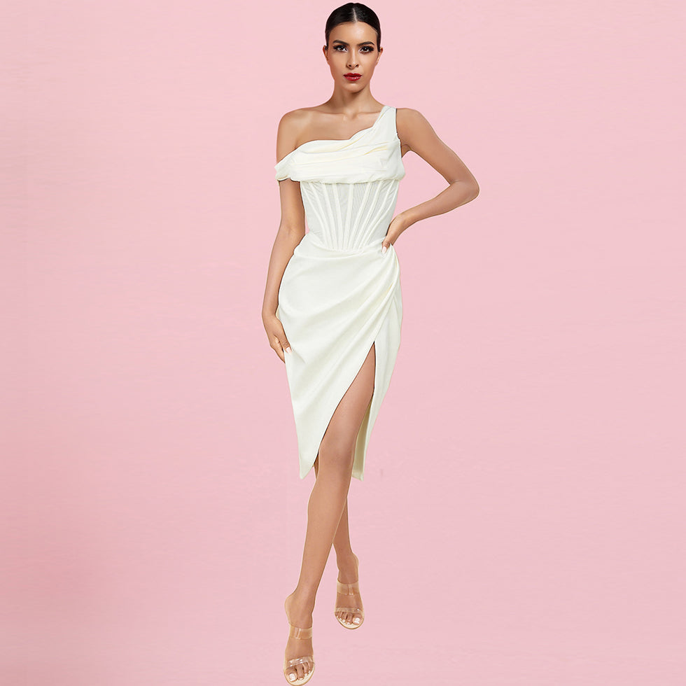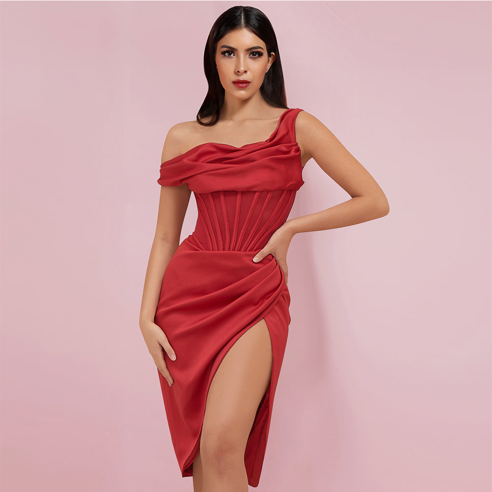 One Shoulder Short Sleeve Asymmetrical Midi Bodycon Dress