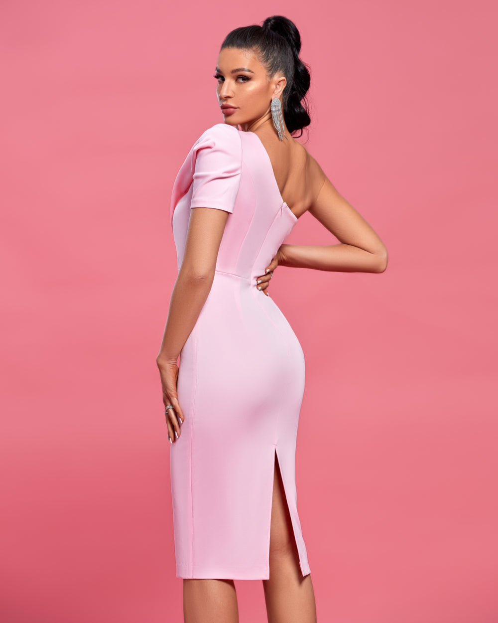 The Suzie Dress designed in a soft candy pink scuba features figure hugging mid-length silhouette with a pleated bodice leading into a draped shoulder detail and sleeve. The Suzie Dress is the essence of elegance and style. Completed with an invisible zipper. this stylish midi is perfect for any formal occasion.