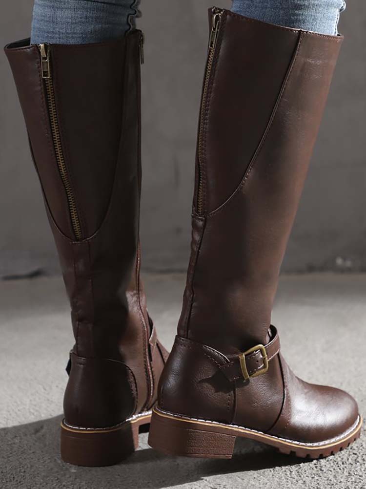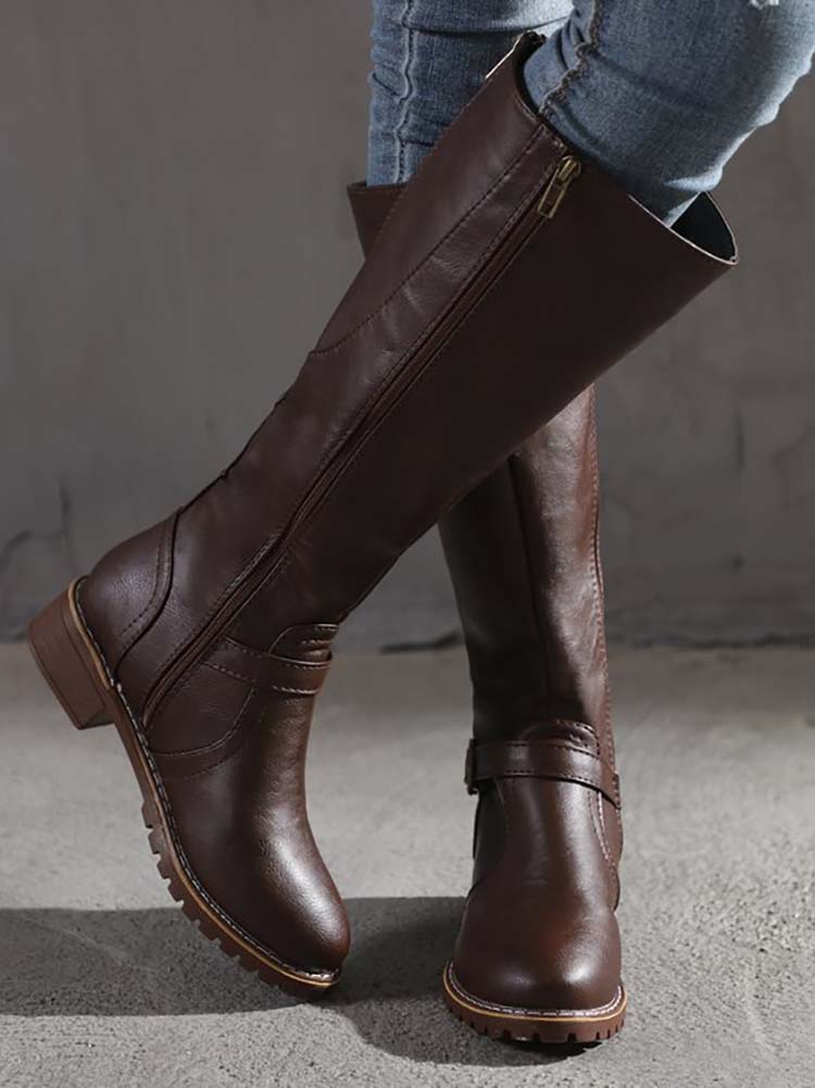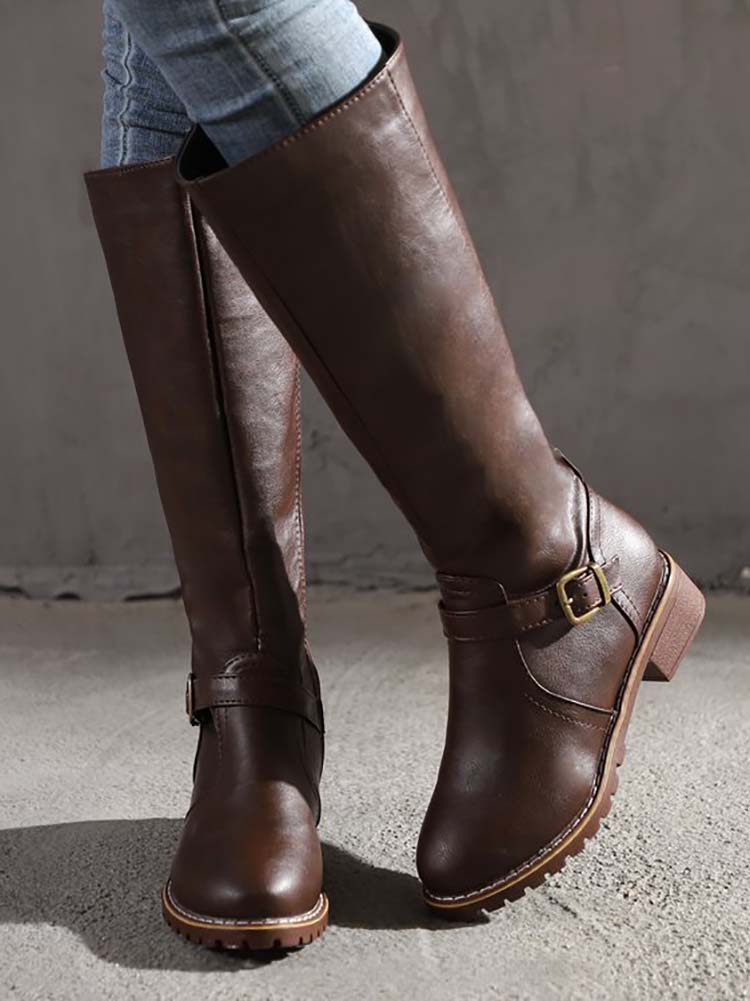 PU Round Toe Knee High Boots