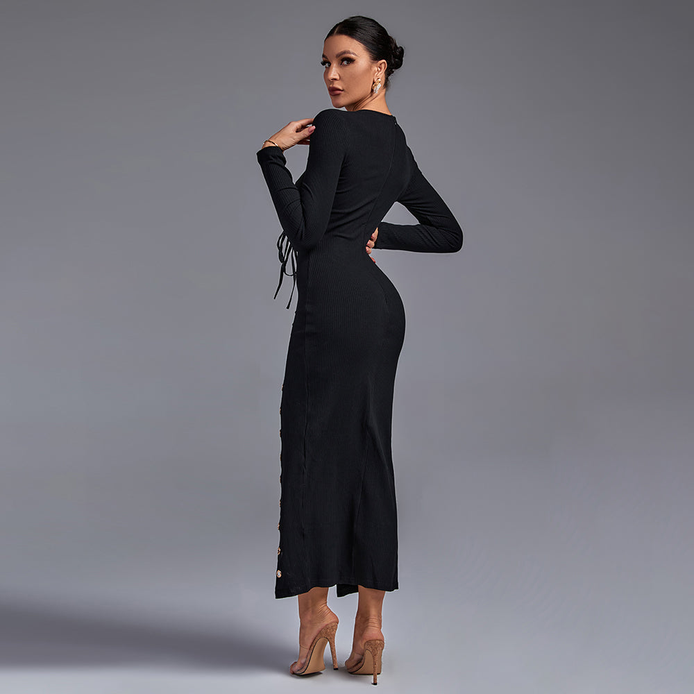 Round Neck Long Sleeve Lace Up Over Knee Bodycon Dress